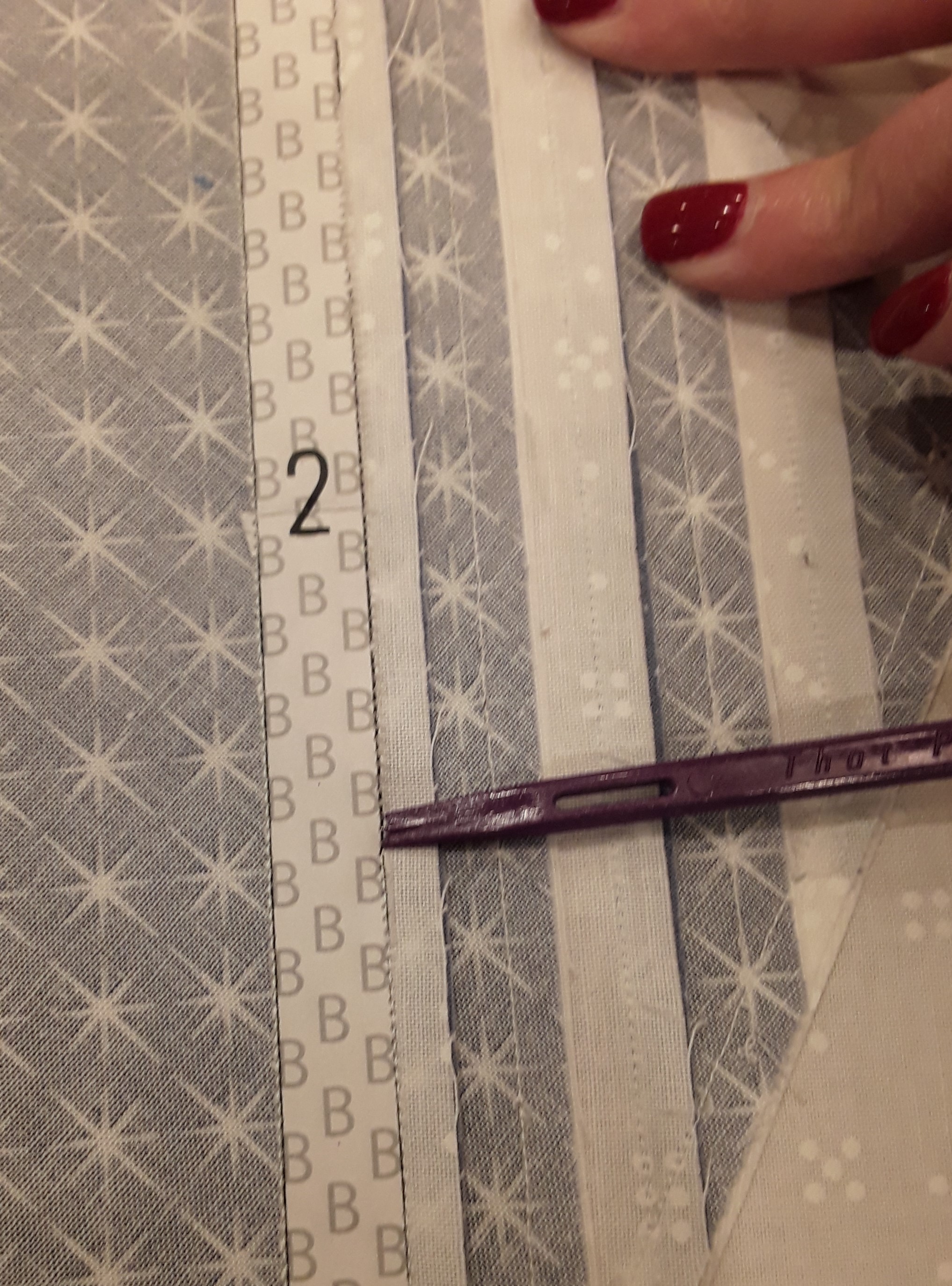 My tips this week is thanks to another friend Diane Z. She was ripping the paper off the back of her paper piecing project at a getaway this winter and said I’ve got a tip for you….she was using her “purple thang” to lift the paper and run it along the seam line to soften the paper at the stitches. It made it much easier to lift up the paper and away/out from the stitches. Fantastic and no ruining the nail polish <grin>.