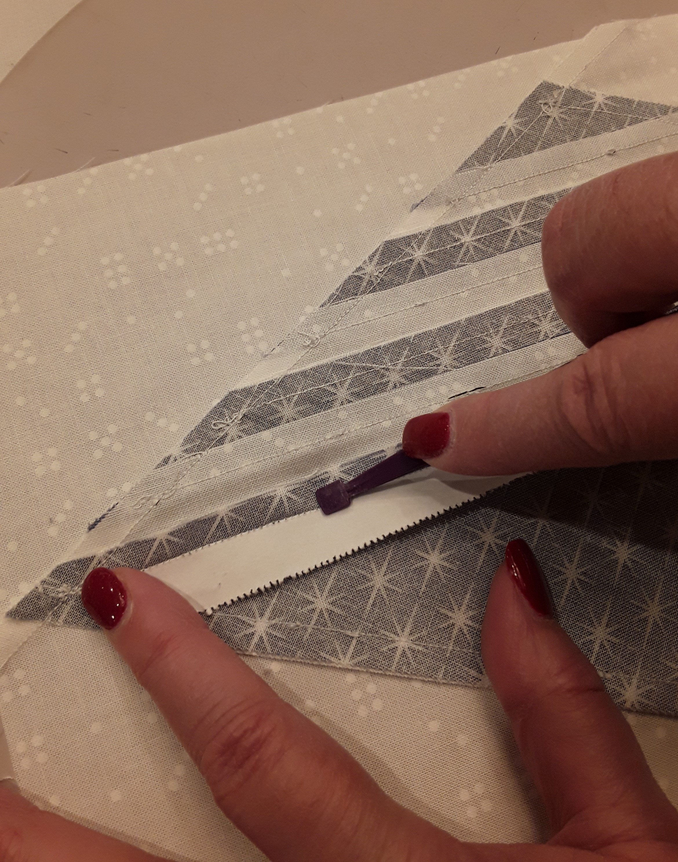 #2 – Run the flat edge of the “Purple Thang” along the stitching line to loosen the paper away from the stitches.