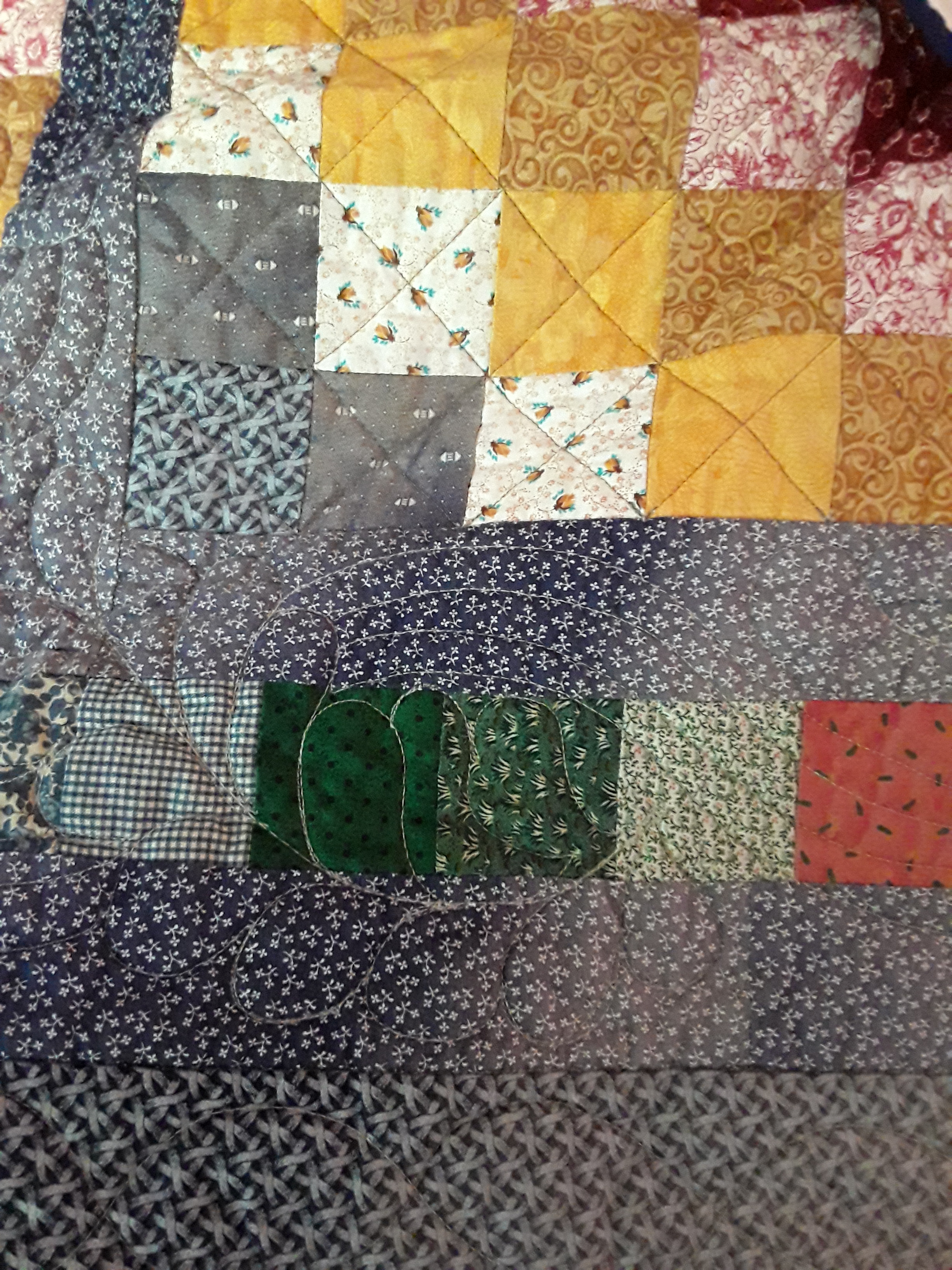 Be sure to check where the sun comes in windows and hits your quilts! As you can see, the most damage was to the navy blue. You can even see what part of the edge was tucked in a shadow.