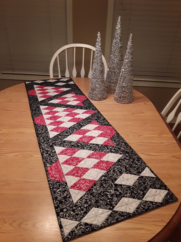 This is a continuation of my Winter Tree-Land. I’m calling it Winter Tree-Land Table Runner, no change of thought there <grin>! Once you make a few trees from the Christmas Countdown you’ll be ready for this wonderland. I’ll be making this pattern downloadable! (fingers and toes crossed) Of course, I’ll have the pattern available in paper form also. This pattern has VERY detailed cutting instructions. Nothing difficult, just detailed. Once your cutting is done, the table runner goes together quickly.