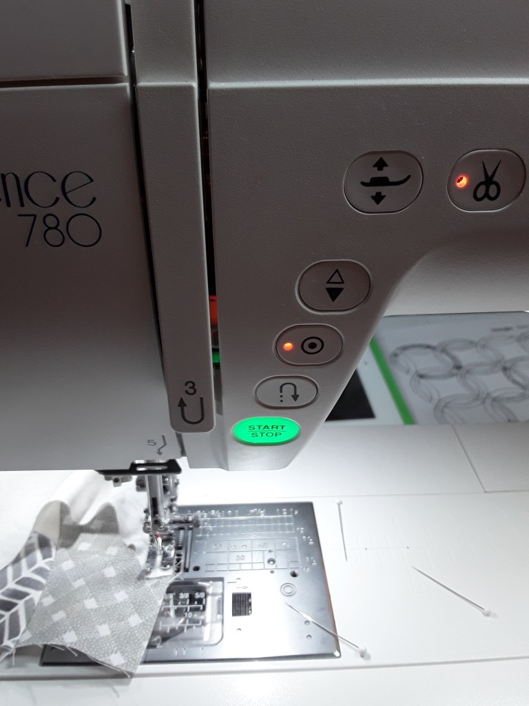 I’m working on a long overdue project. It is a double wedding ring. I borrowed a friend’s machine as mine is not feeling well. (I hit a wire in a mask I was making.) It needs a tuneup! But that isn’t what this post is about. It is about working with a different sewing machine than what I usually sew on. In the past, I have not liked using an automatic presser foot lifter and thread cutter. I like to have my presser foot down when I stop and have my threads pulled to the back of the machine before I start. With newer machines, the “cut” and presser foot button is a feature many now have.