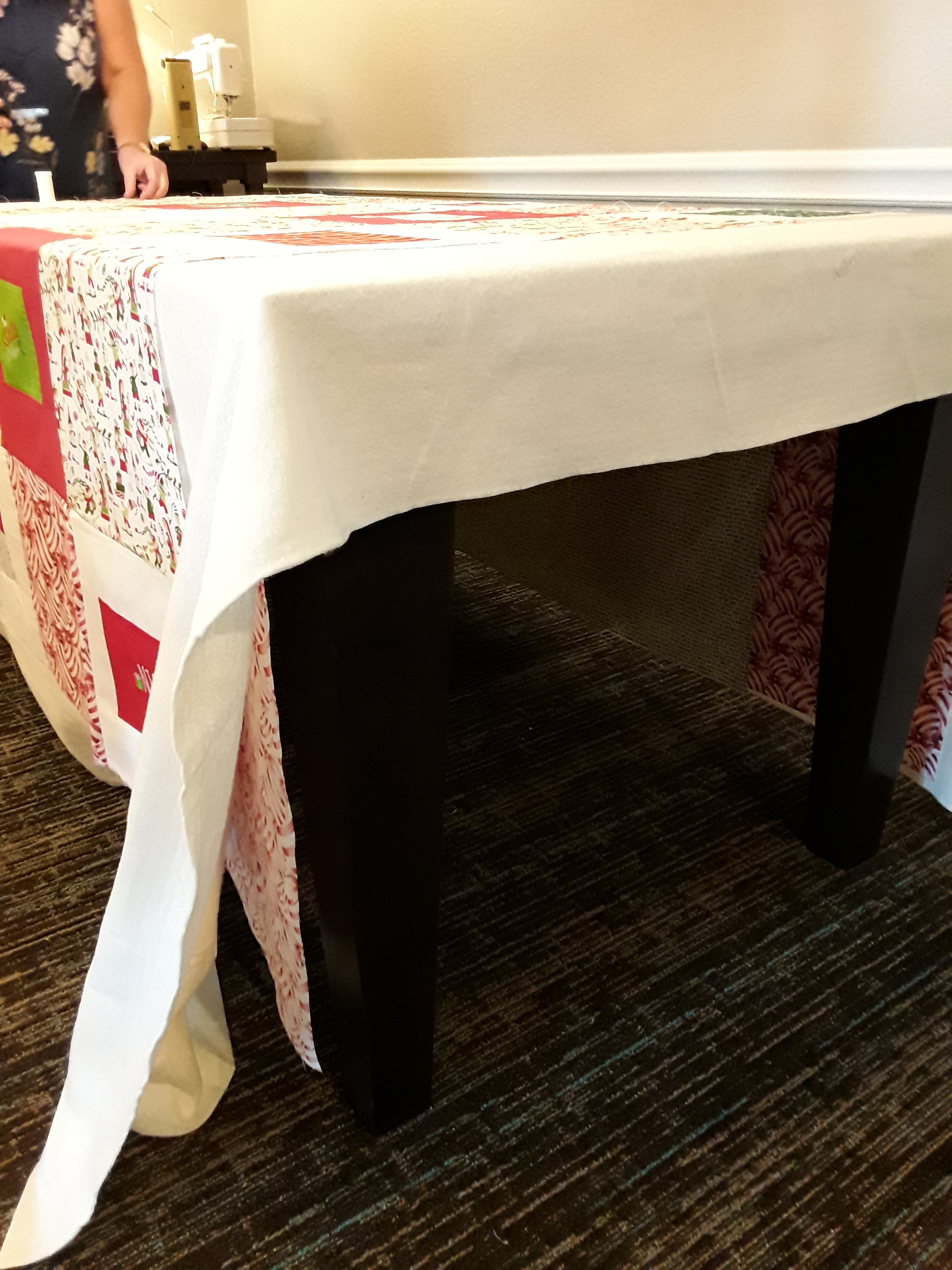 We did have a large table to baste the quilt together and we basted in sections. We started in the middle. Basted all the center section then moved the quilt sandwich to baste each side. Worked great. I typically tape the backing to the table so it is taut. This helps to ensure you don’t have any ripples in the backing fabric. No tape here, so we pulled gently, one of us on each side and made do!