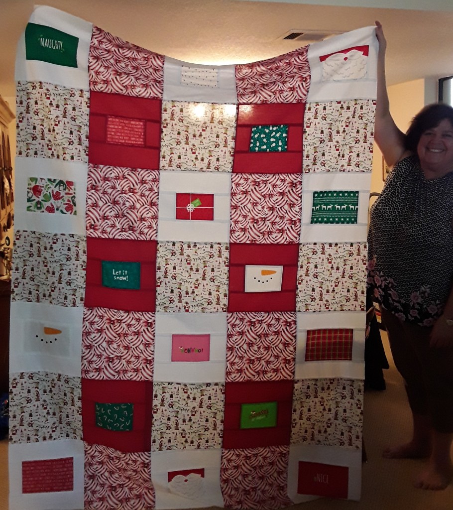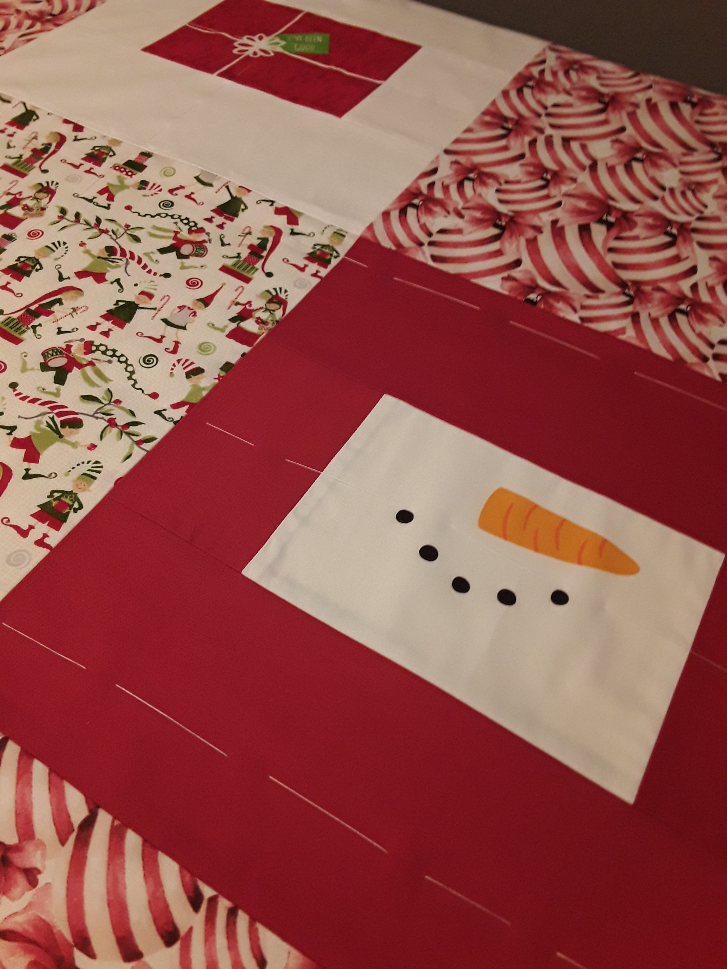I finished my Christmas sewing! I made 24 double sided napkins from the Holiday Flourish fabric, eight each to my mom, sister, and sister-in-law. I loved how they turned out. Of course, I didn’t take any photos. Darn. I’m now helping another sister-in-law with her Christmas project. She is making a quilt from the pre-printed masks. She added borders to the large and small masks to create 12″ finished blocks. She alternated those with other Christmas fabrics. The quilt TOP photo is below. It was a quick picture, sorry for the blur.