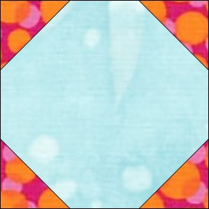 The challenge is using a snowball quilt block. So, what is a snowball block? It has a solid center and four triangles on all four of the corners. The triangles to do not meet in the center. They typically cover 1/3 of each adjacent side. See below!!