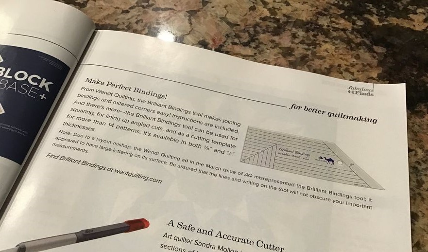 AQ Magazine (American Quilter) an American Quilter’s Society publication has a Fabulous Finds section. I’m super excited to share one of the “fabulous finds”….Brilliant Bindings!!!!! I knew it was going to be highlighted but didn’t want to give it out before it happened. It is the May 2021 issue. I haven’t received my issue yet but several quilter friends have. Thanks to Kathy Beltz for sharing a photo on Facebook of the “find”. It is below. If you are an AQS member and get the magazine, you will have it!!