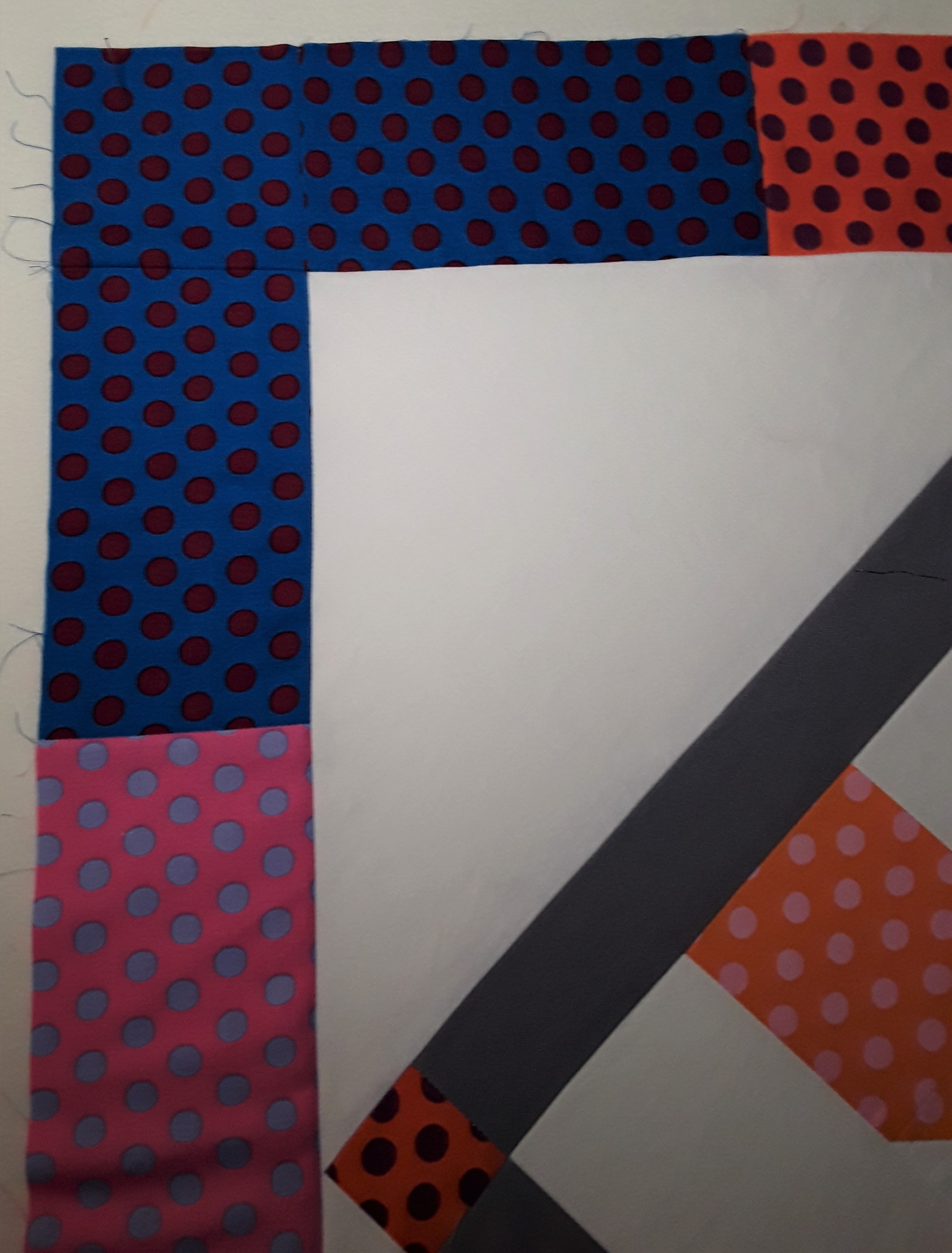 I want to point out some things that happened and my fixes/decisions/finish. So, one of my fat quarters was not quite a FQ. This resulted in running out of fabric for a few border pieces. No fear, I have IDEAS! So, instead of searching for more fabric, I used what I had on hand. I bought this wonderful blue background Kaffe dot to use as my binding for this quilt. Thankfully, I bought extra.
