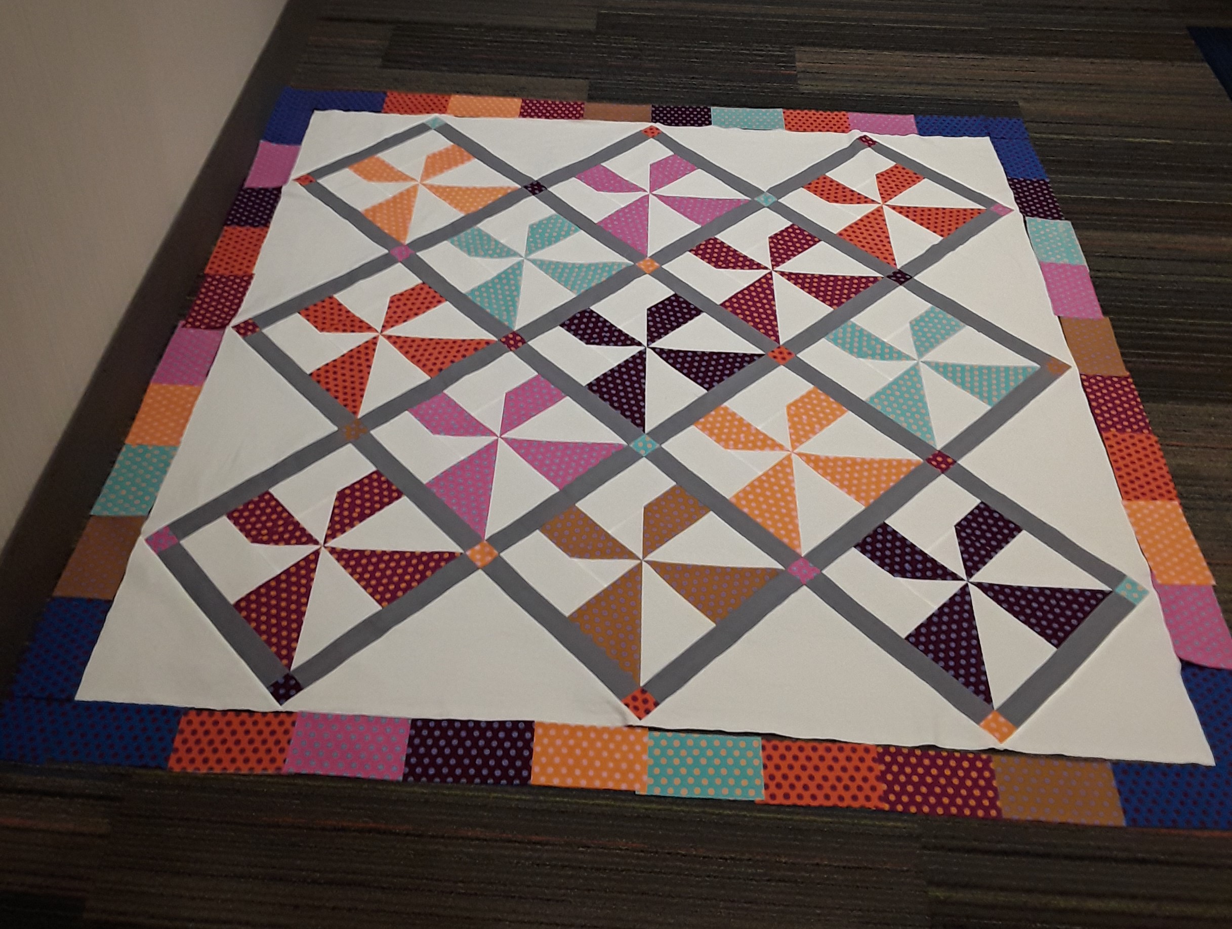 I had wonderful Saturday… at a Sewcation!!! I was so excited to be back in a room with like minded quilters and my friend Cheryl! Thanks to Gina Zeleznok of Stitching with Gina for her one day Sewcation. We each had our own table to sew at and every table was 6 ft. apart. We wore our masks when not sitting at our sewing machine and it worked well!!! I took my Pinwheel Bows to finish up the border. So that is my challenge finish! It is amazing how a border can simply pull an entire quilt together. Photo below…