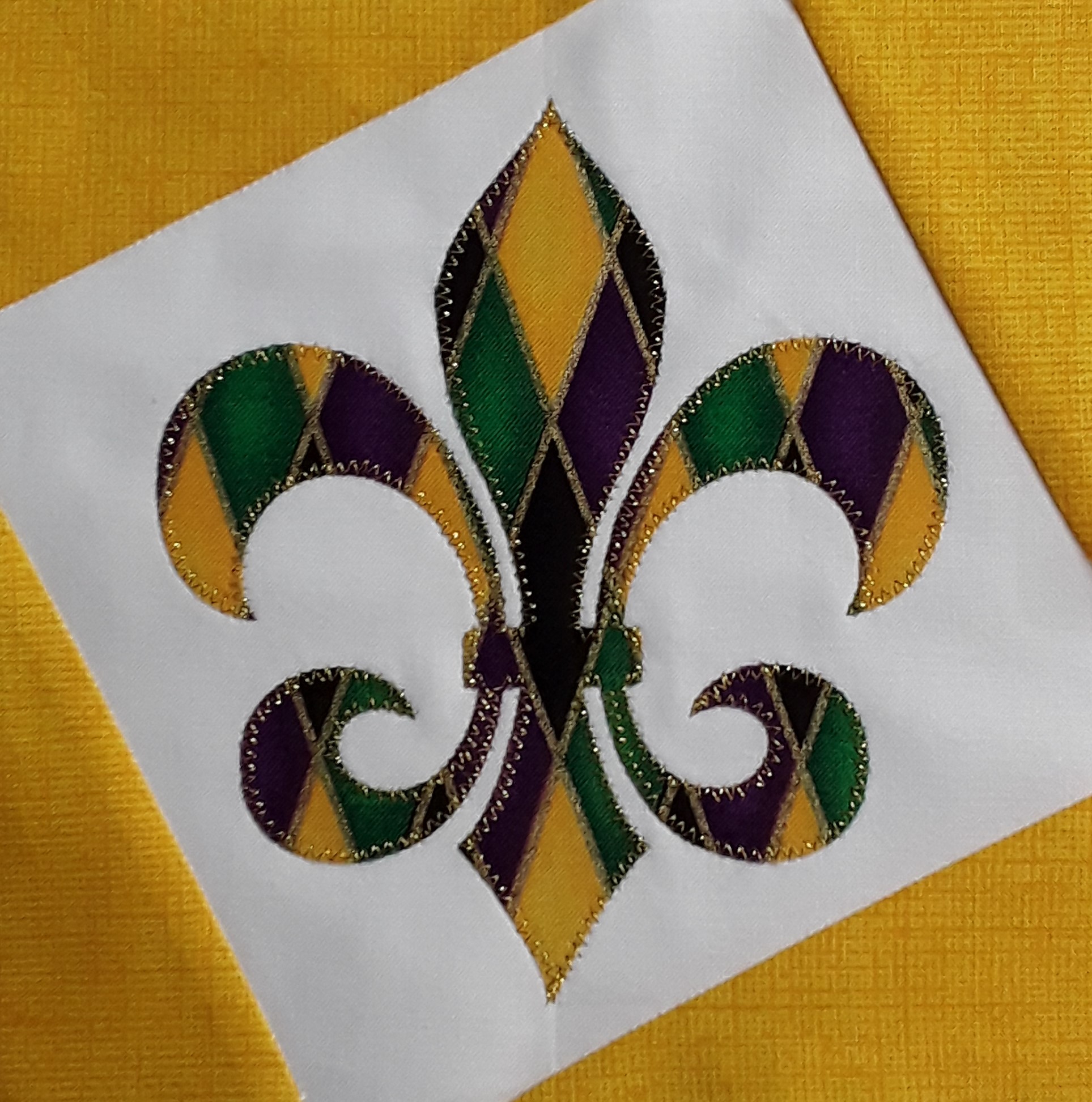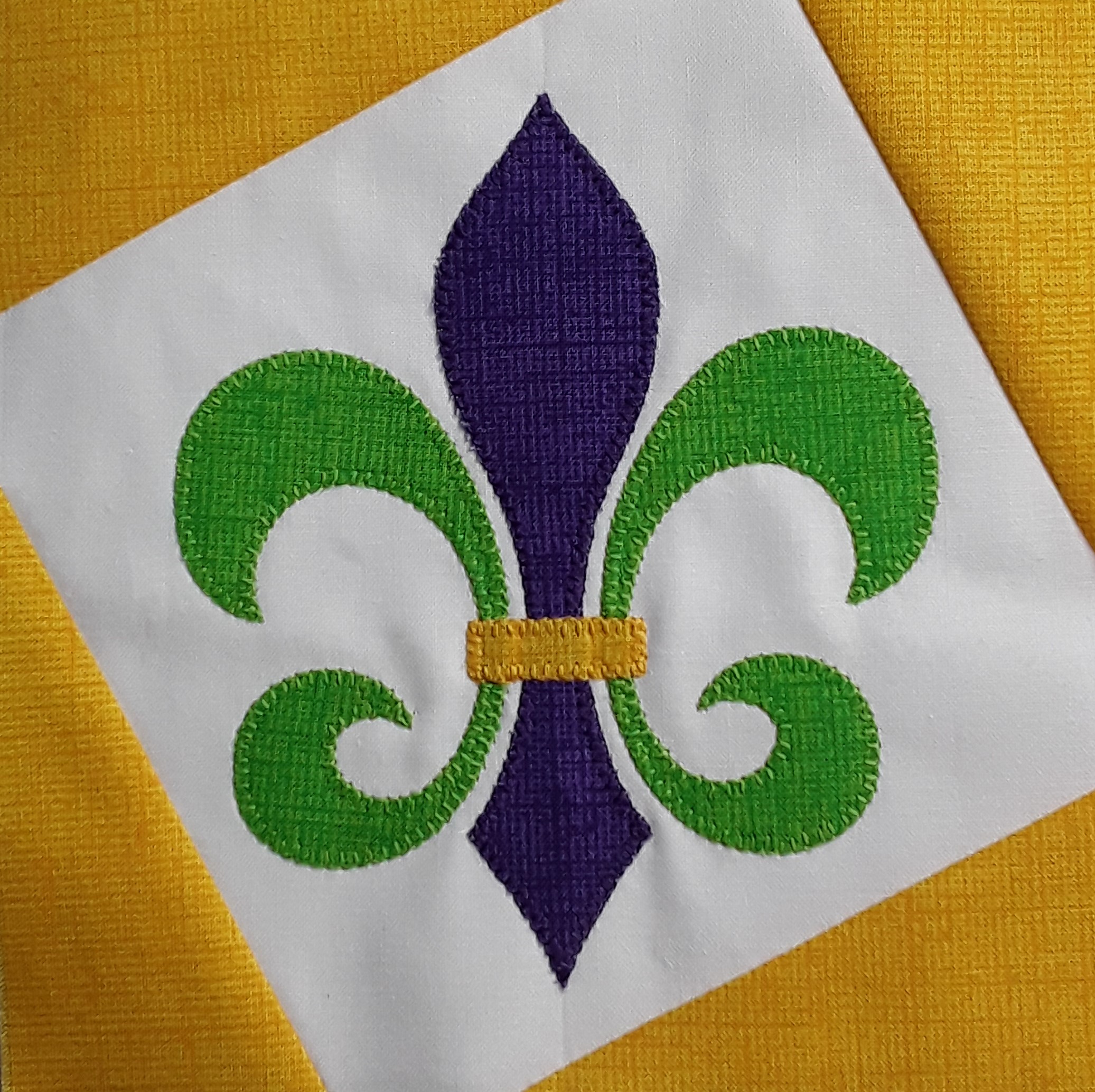 You can find the “Louisiana Fleur” on my website, Wendt Quilting (www.wendtquilting.com), under free patterns, look HERE!! I have made two different versions/options. The first option is a single fabric Fleur. The second option is a three color Fleur. My coloring definitely shouts Mardi Gras! You will find both options in the pattern. The background block is paper pieced for accuracy. I love the angles and how it highlights the Fleur. You will see in the photos below, both options. I used a gold zig zag stitch for the single fabric Fleur and a buttonhole stitch on the three color Fleur. I do have KITS available on my website! Laser cut pre-fused fleurs (both single harlequin and three color Mardi Gras). The center background is white and the corners are yellow/gold. I will also have additional choices for the angled corners. There is a limited supply of each option, so don’t delay in ordering your kit!