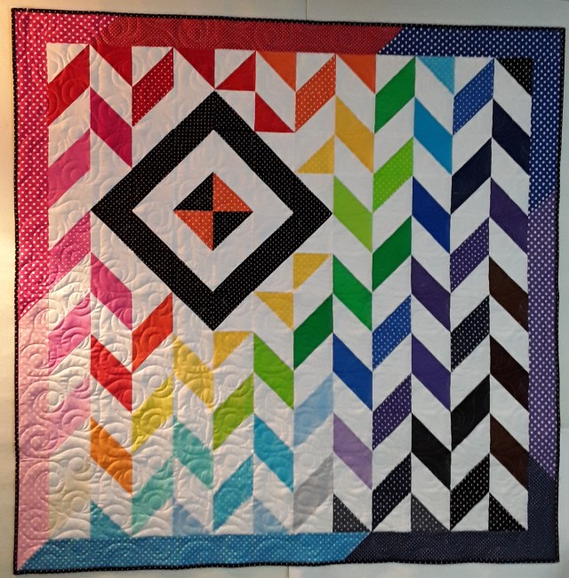 I promised photos from last week. I can reveal one challenge. The other will be next week. This reveal if for BVHQ (Blackstone Valley Heritage Quilters) Half Squares Challenge. The challenge included making 144 half squares of any size and fabrics of our choice. I had a charm pack of dots and blenders. There are fabrics from Michael Miller, RJR, P&B and more (I’m sure more, as that is how I collect fabric!! <grin>) I added Kona white to make two identical half squares. Since we could make any size half squares, I cut the white into 5″ squares to match the charms. Perfect and I trimmed to make 4″ finished Half-squares (4 1/2″ unfinished). When making the half squares, we did not know out layout. What? YES, we did not know how we were going to put our half squares together.