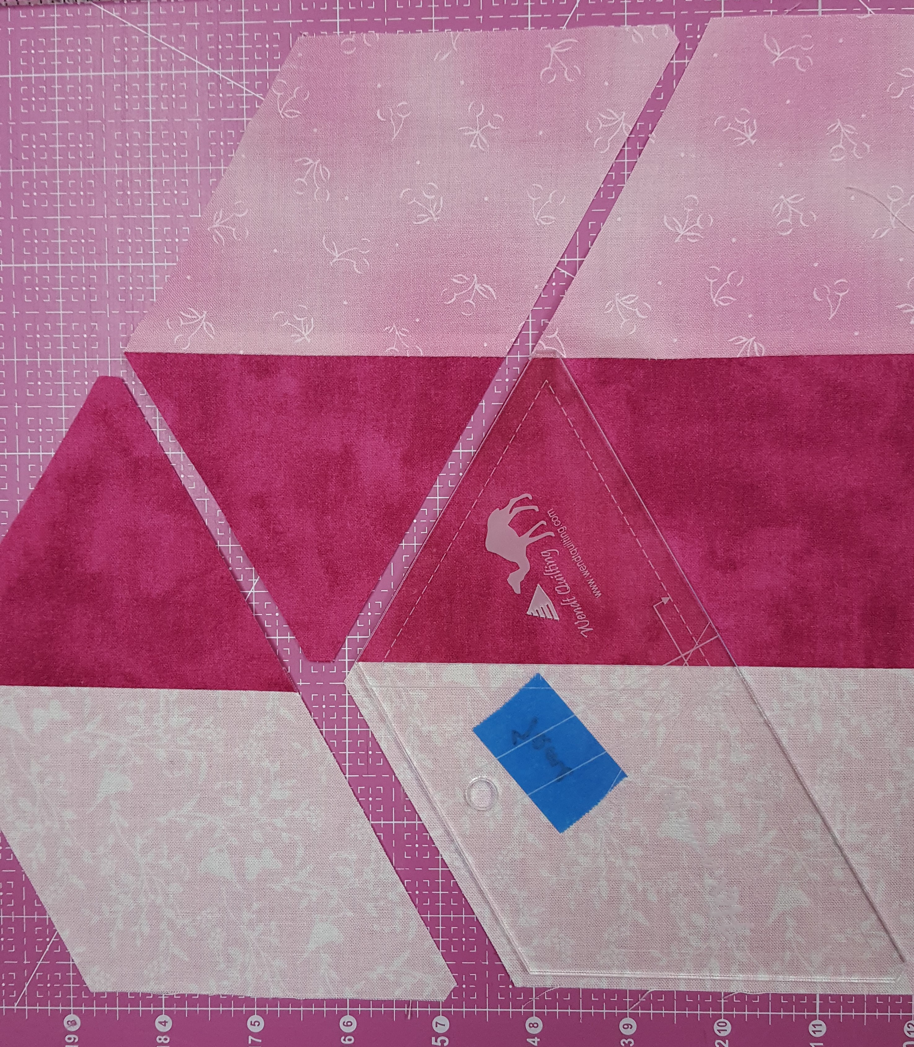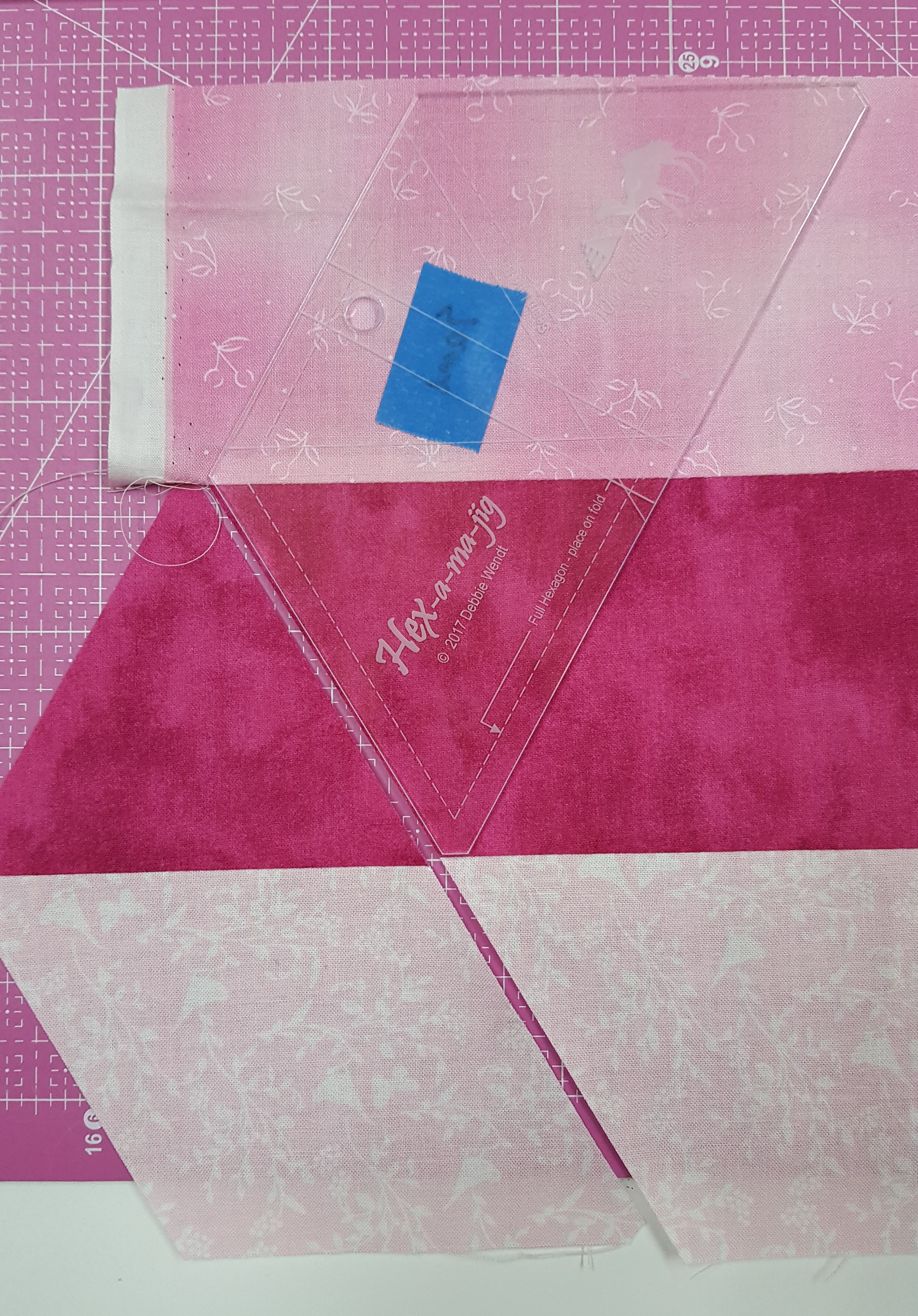 But with Hex-a-ma-jig or Hex-a-ma-jig Jr., you can use a strip pieced unit to accomplish this! The diagram below is three strips sewn together (medium – dark – light). Using the dashed seam lines on my Hex tools you can cut both side of the block from this strip pieced section. The blue tape on the tool is to clarify placement and to show position for the photo.
