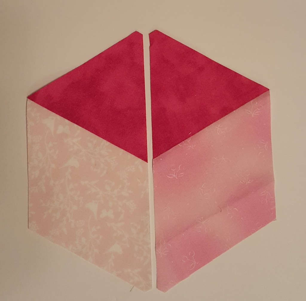 The traditional construction is three diamonds sewn together into the Baby Block. To avoid a “Y” seam you can make the same block with a triangle on top of a diamond.