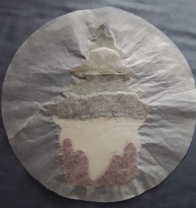 I’m working on a couple ornament projects with Christmas fast approaching. The first one is for a secret gift, but I wanted to show the back and a solution….well, actually what I used in desperation. I needed a temporary backing for this ornament. I forgot to bring any spare fabric on my trip, so how about a coffee filter. It worked to cover the fusible and is soft and thin to stitch through. I’ll give a report when it is finished and given!