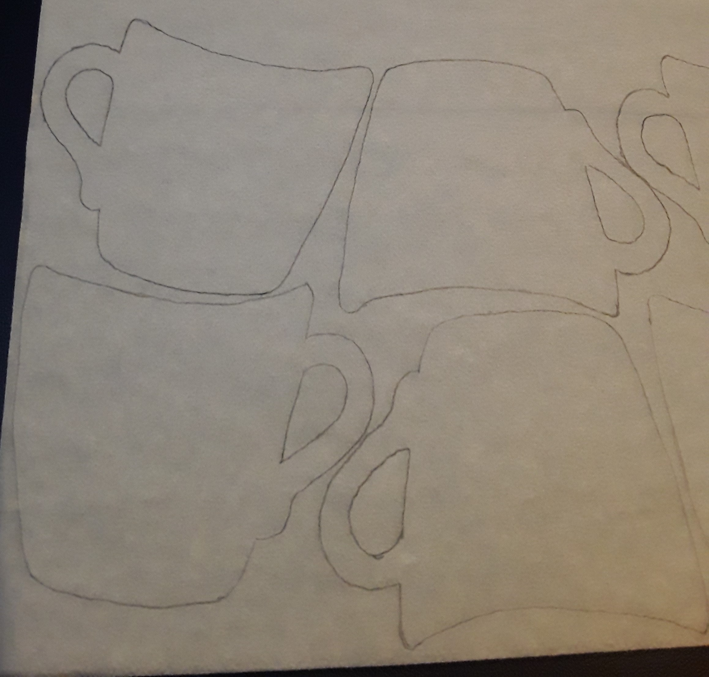 The second is also a secret… in tracing the cups onto the paper back fusible, I decided to make some right-hand mugs and some left-hand mugs. (I started tracing onto the paper and realized I could have both “hands”. It will be fun to see if anyone notices that some are right and some left. Shhh, don’t tell!