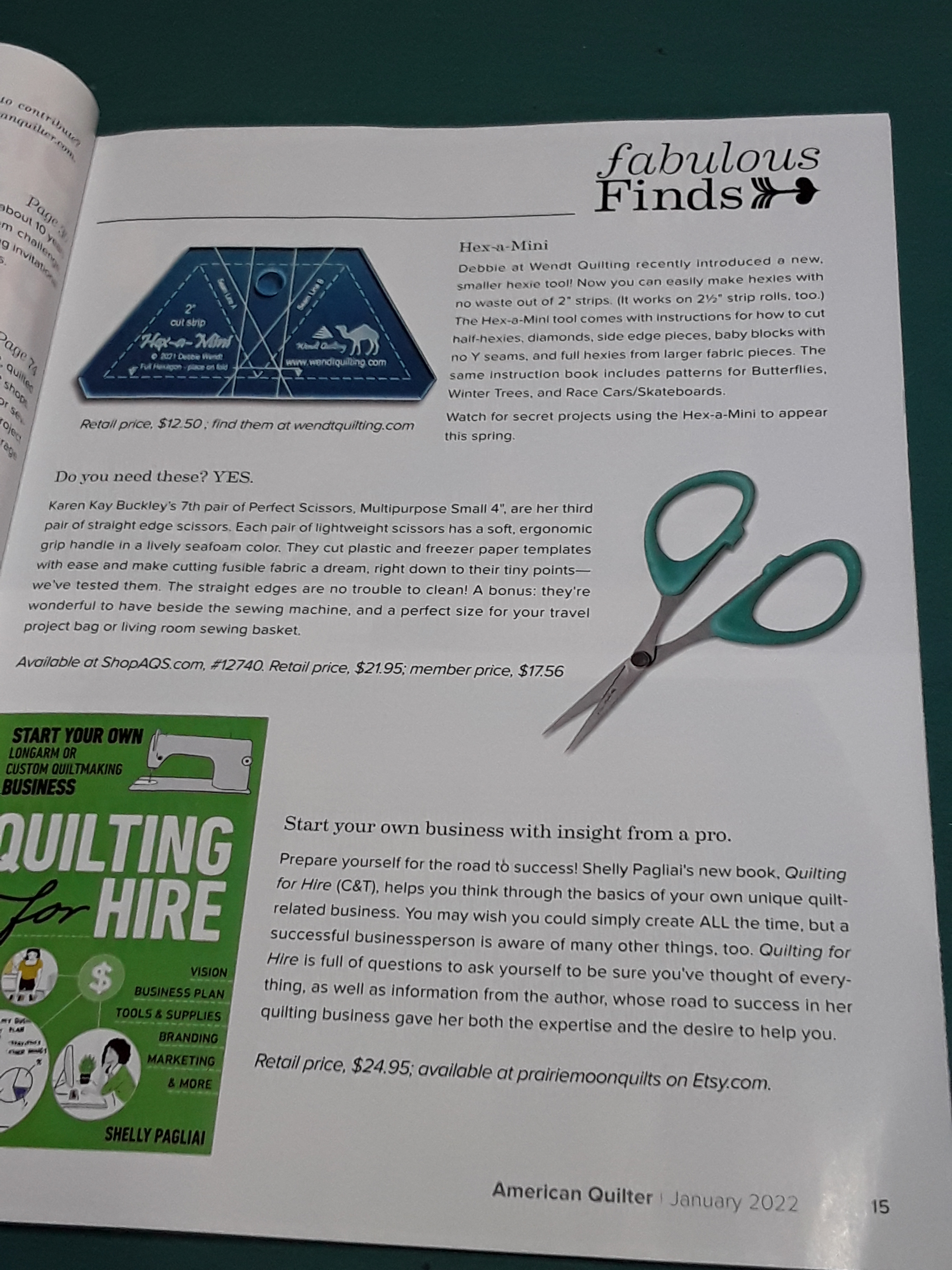 Are you an AQS member? Did you get the latest American Quilter magazine, January 2022? Check out page 15 for fabulous Finds….I’m so excited Hex-a-Mini is a featured FIND!!! WooHoo! See the page below with a closeup of the write up!