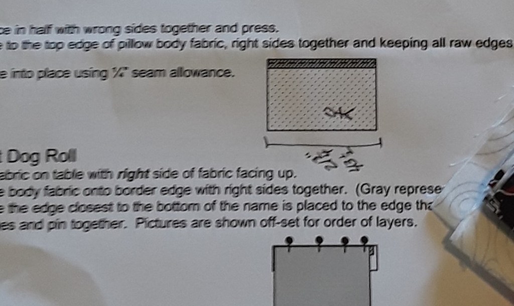 #2 – If you have a directional fabric, make sure it falls in the direction you want it on the end product. Below you will see how I made a stick figure on the pillow piece diagram to make sure it would end up correctly. (Yes, blurry since I blew up the original photo. My stick figure is shown on its side!)