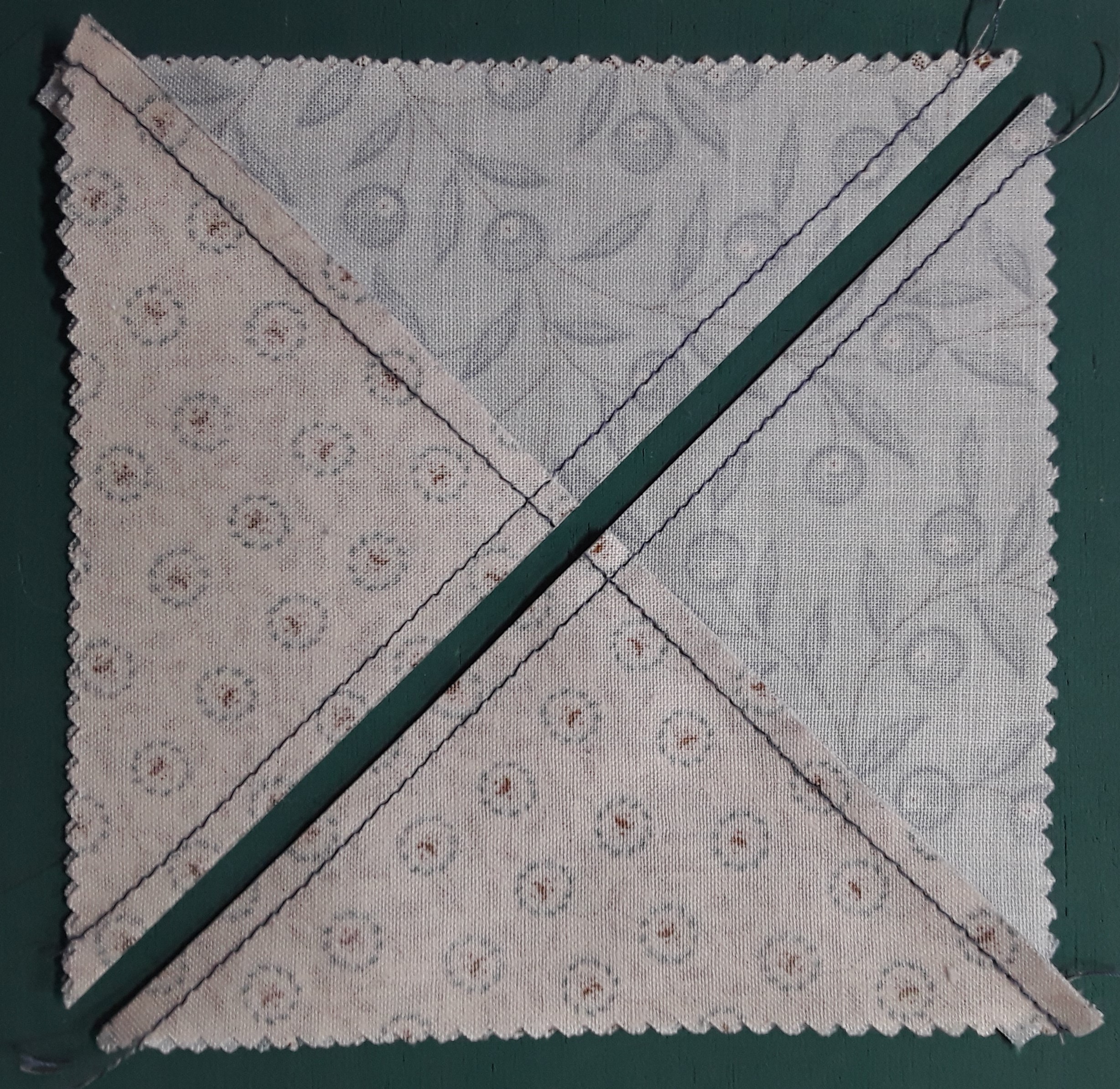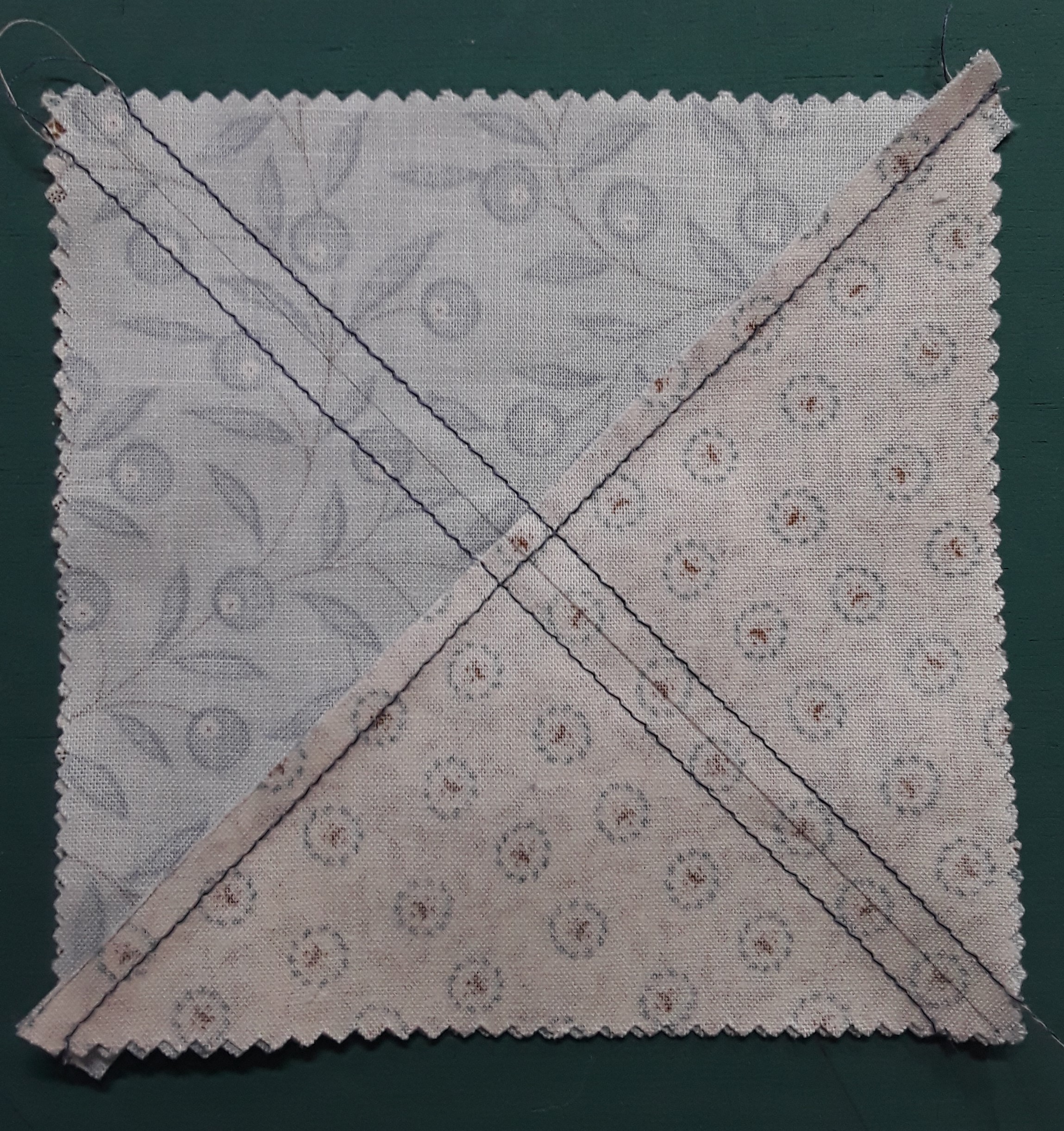 Cut this apart and press towards the darker fabric. The rotate one half so the light is on the dark and dark on the light matching seams snugly together.