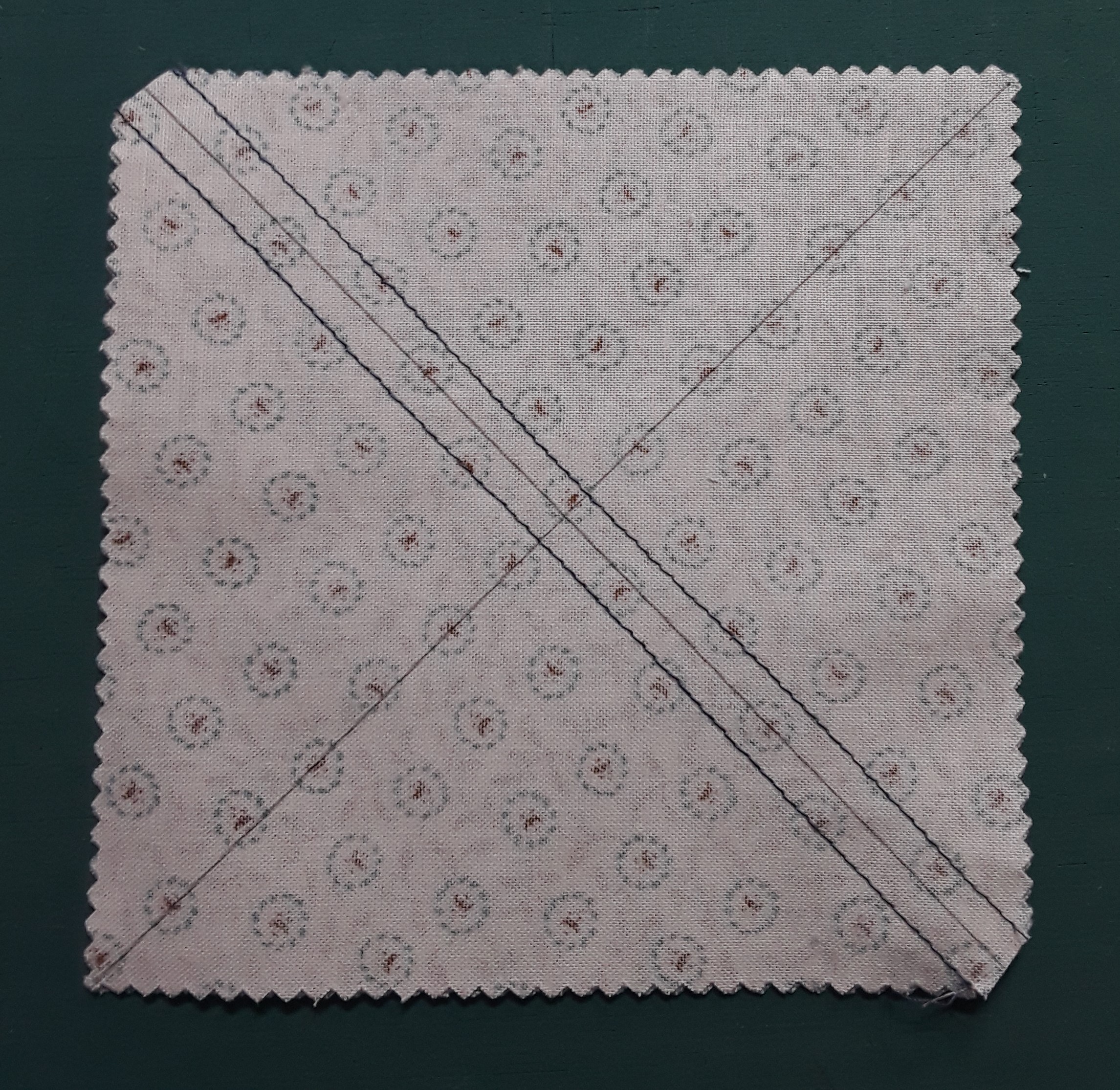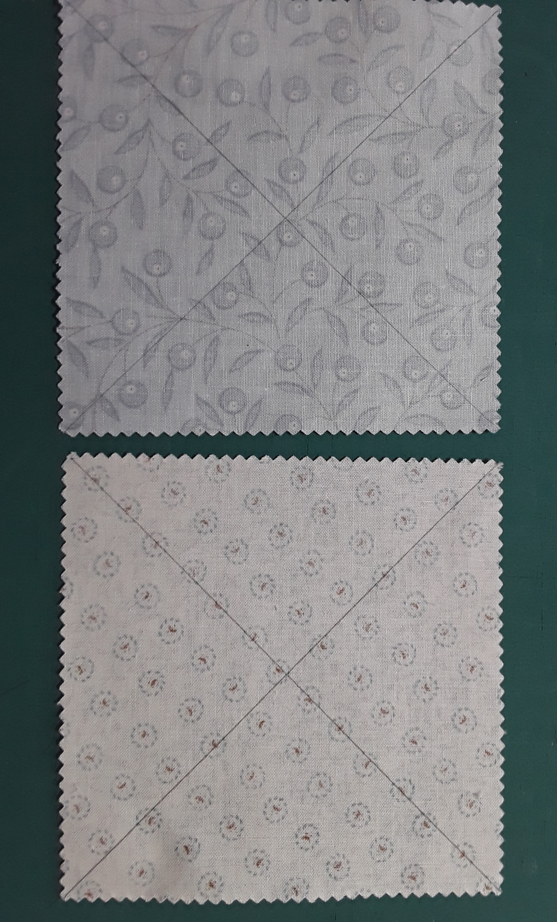 #1 – Mark from corner to corner on the wrong side of both the light square and dark square. This saves time later. The lines are there and you don’t have to stop and redraw the line on the back of the dark fabric.