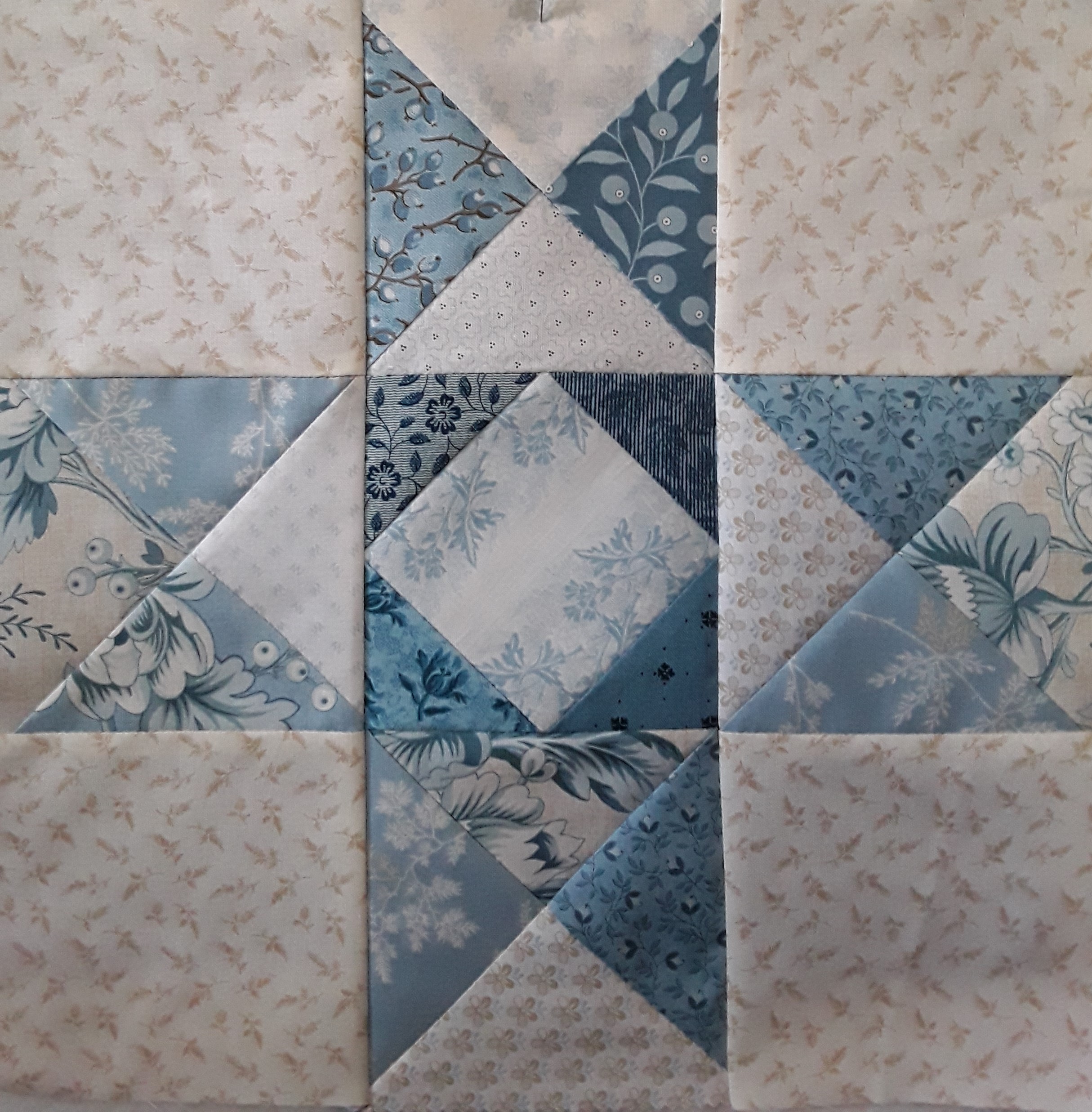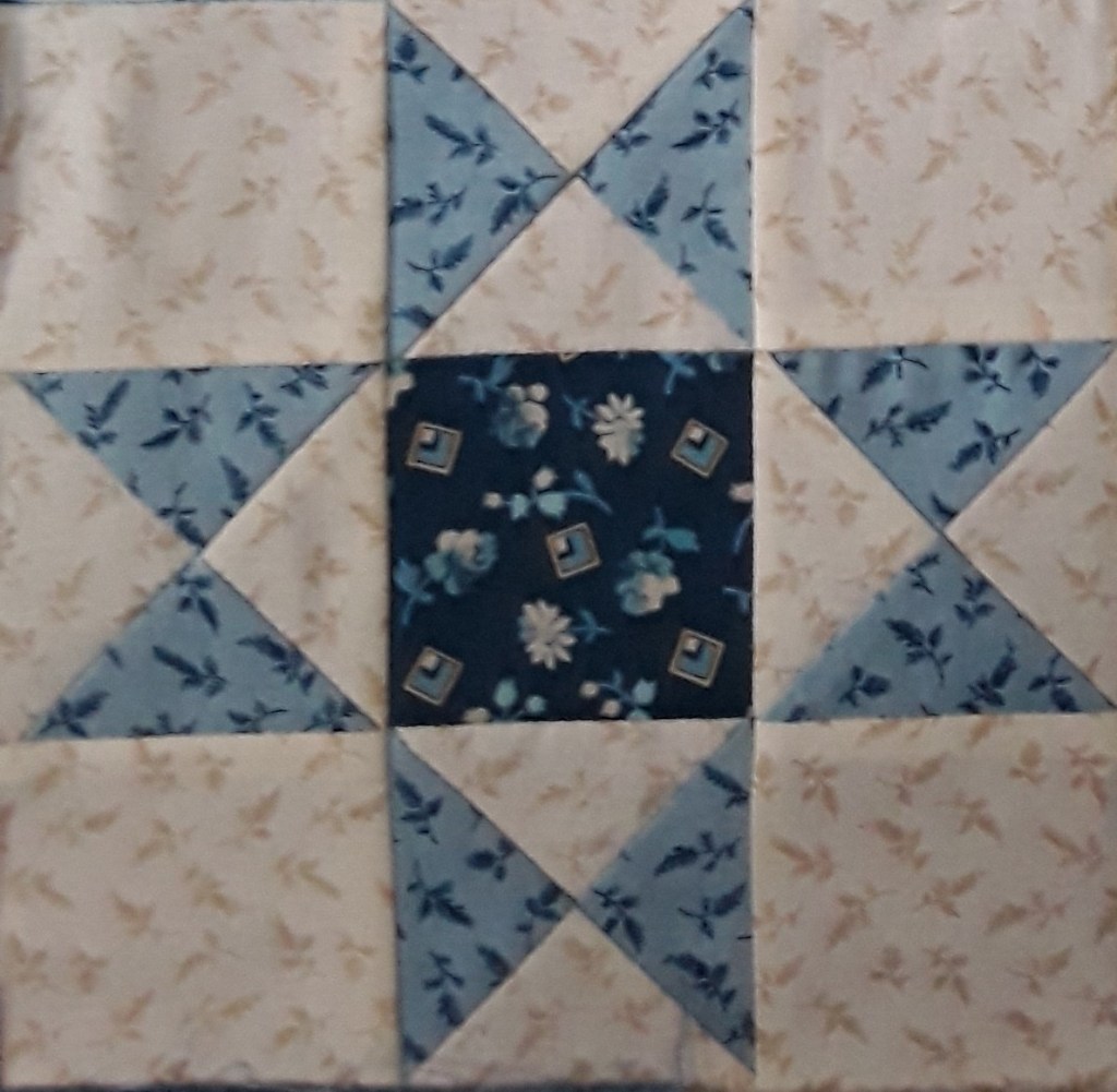 The basics of an Ohio Star Block is 4 quarter squares, a center square and 4 corner squares. One of the block colorings is shown below. Often the inside triangles off the center are a different color. The next photos below shows that coloring but points and backgrounds are scrappy.