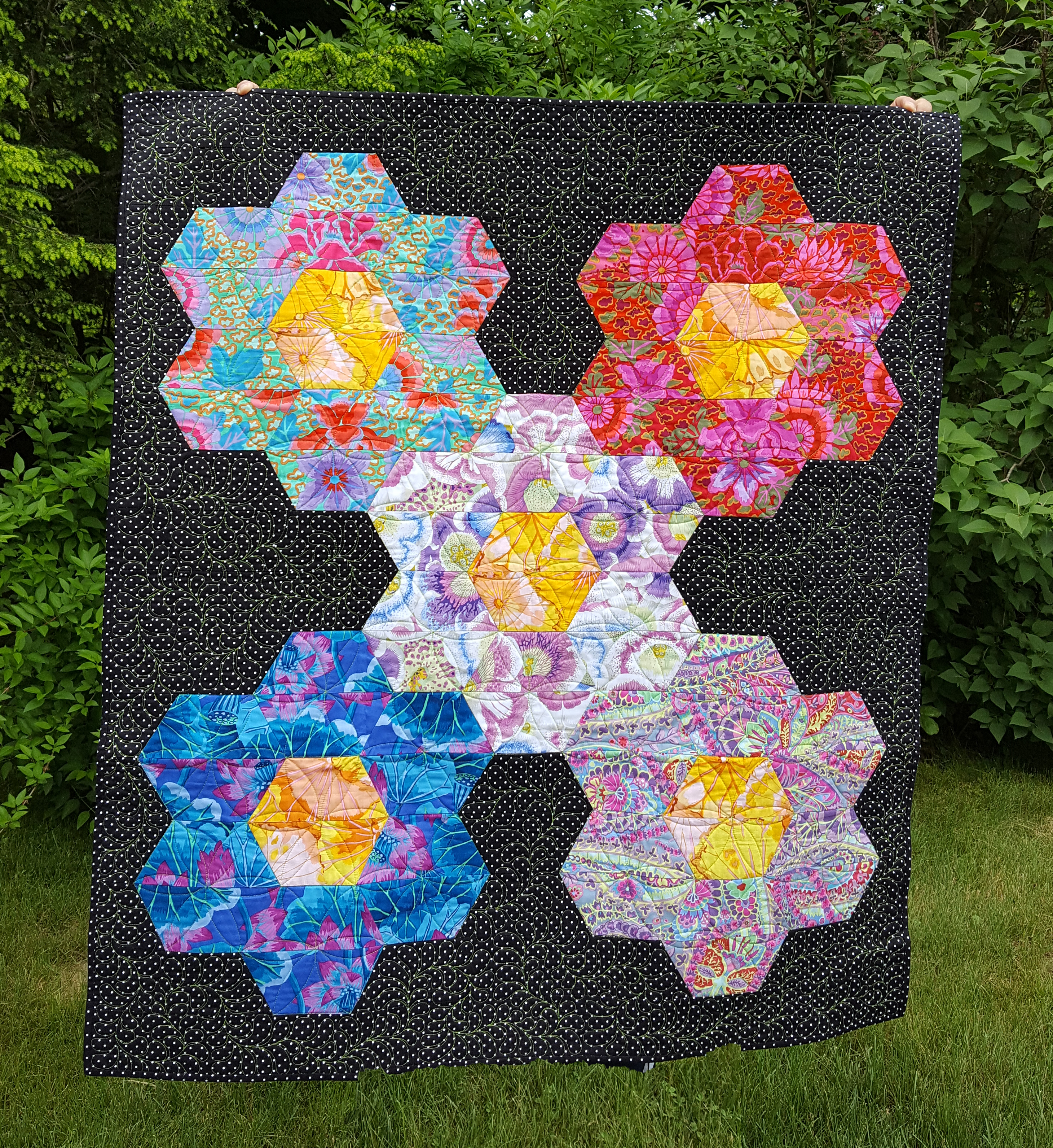 My favorite method for small flower gardens. My Hex-a-ma-jigs are my favorite for larger versions!!I’ll be teaching this machine made Flower garden with Hex-a-ma-jig in Paducah in two short weeks! Thus travel and more travel. I hope you’ll come by my booth up on the second floor Booth 3500 to see demos of all my tools. Until then, I’m going to sit and stitch as I wait for my delayed flight.