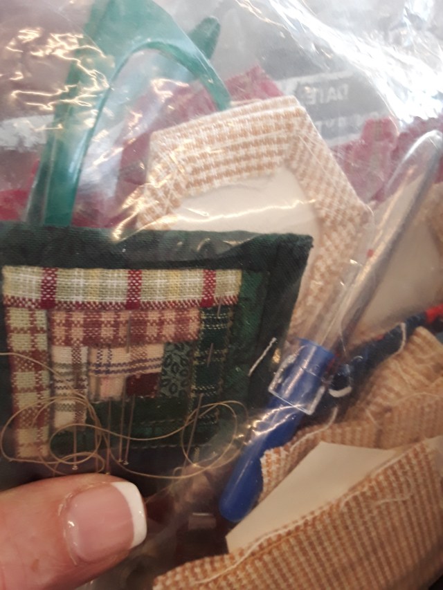 With a lot of travel already this year, I always carry a hand project. I believe you have seen this before. Ye,s I’m still carrying my Plaid Grandmother’s Flower Gardens around. And it has been over 20 years in the making. I hope it doesn’t take 20 more to finish. This is made with 1″ Paper Pieces. My mini tackle box is filled with 3/8″ hexies, a more recent project.