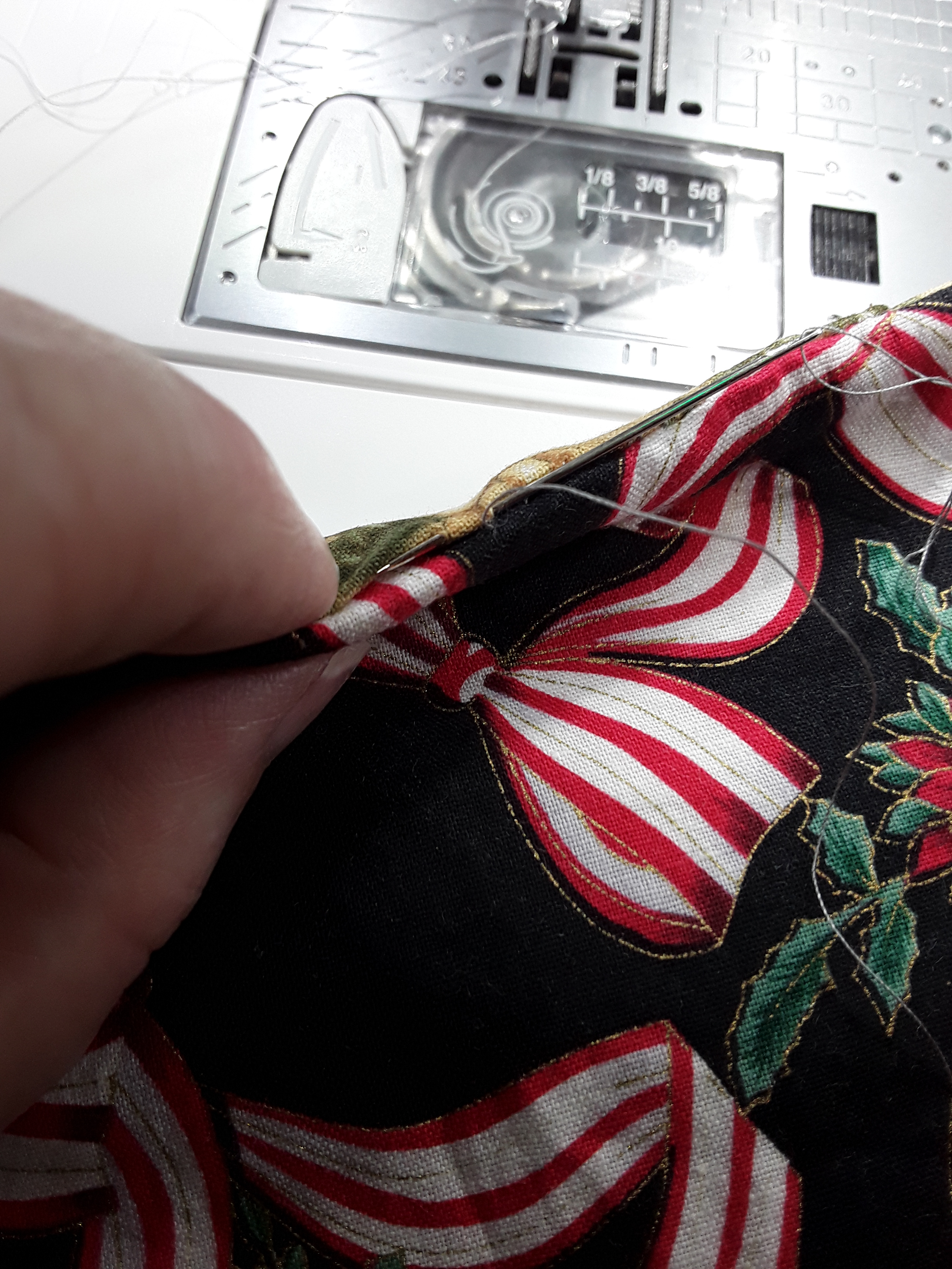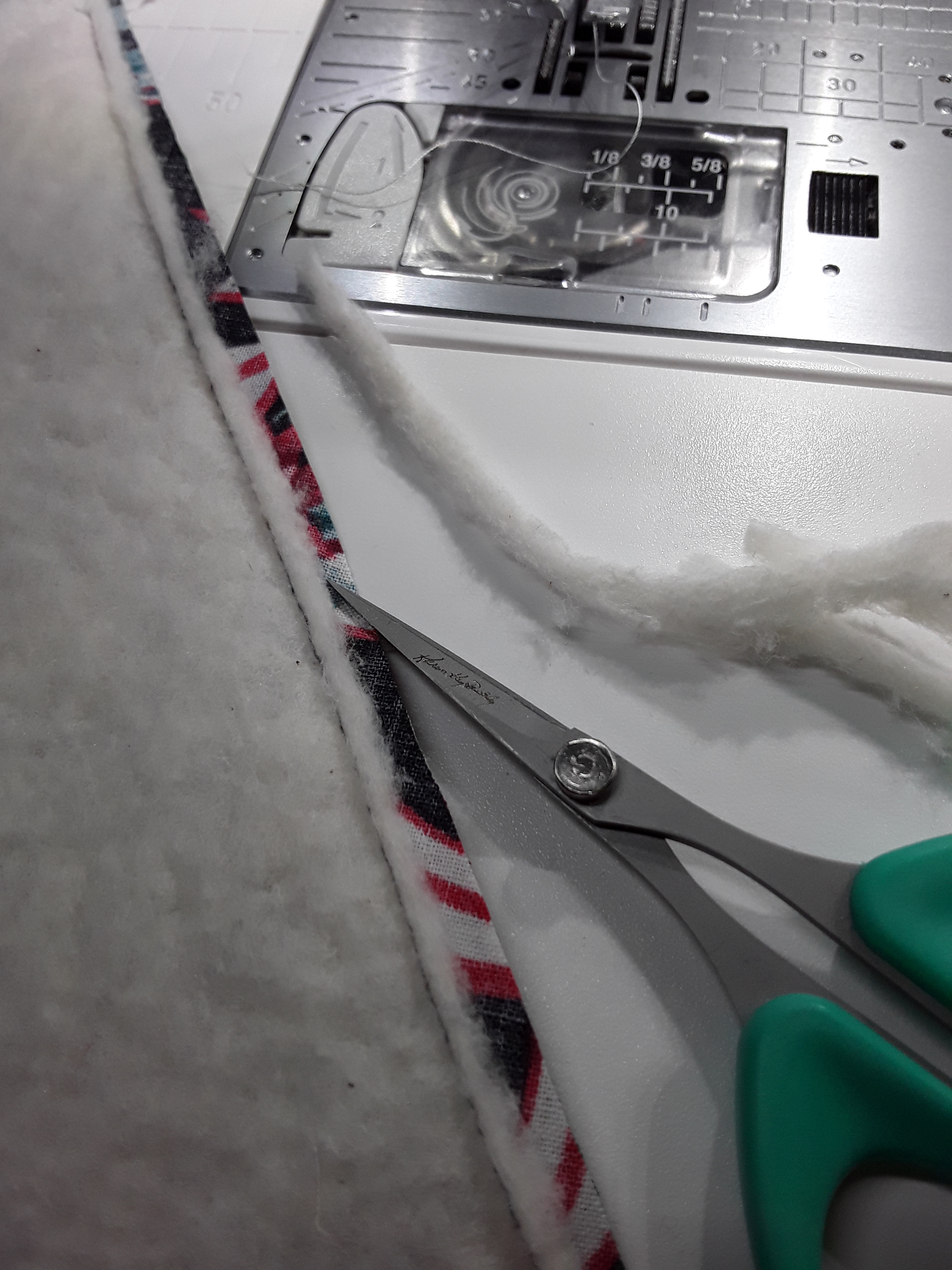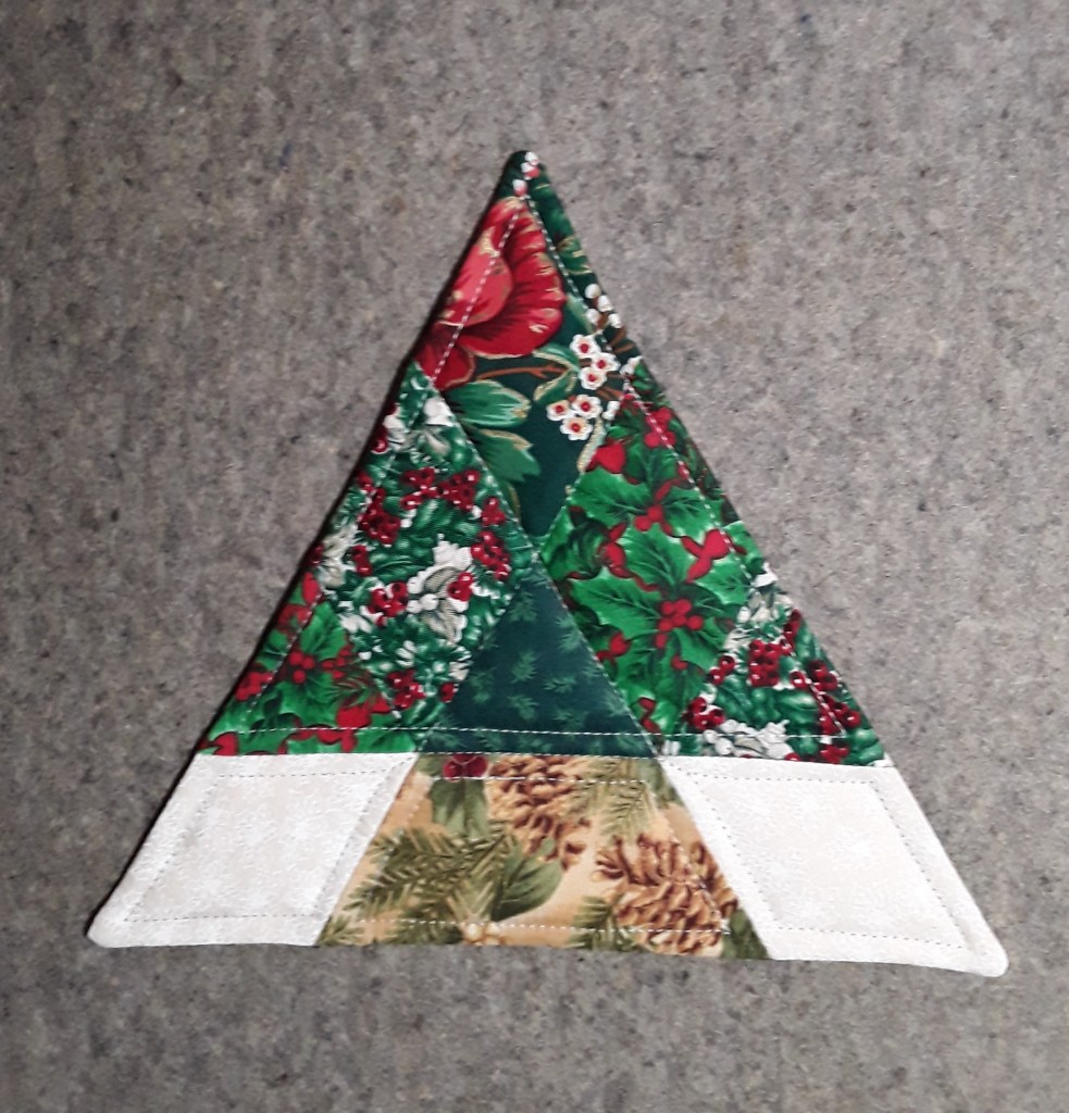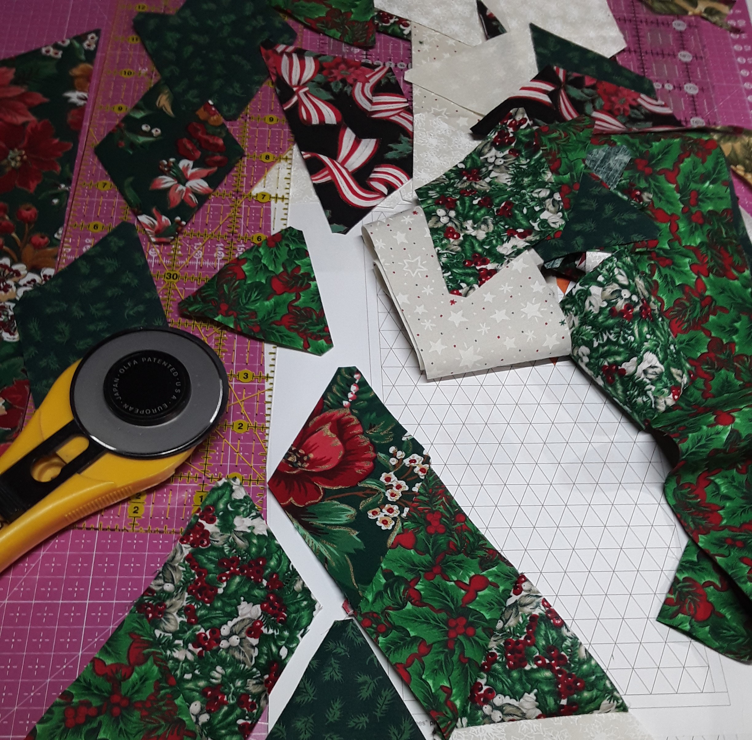 When I began cutting my Christmas fabrics, you will see the mess of how I roll when playing/arranging. Cut many and use few. BUT now I have more to play with for the next one! You will need to do a creative order of piecing, so there is no Y-seam. I stitched the tree “top”, then layered it with batting and backing sewing it like a pillow. Trim off the excess batting in the seam allowance. Turn right side out and hand sew the opening. Then I quilted it. Ta Done!