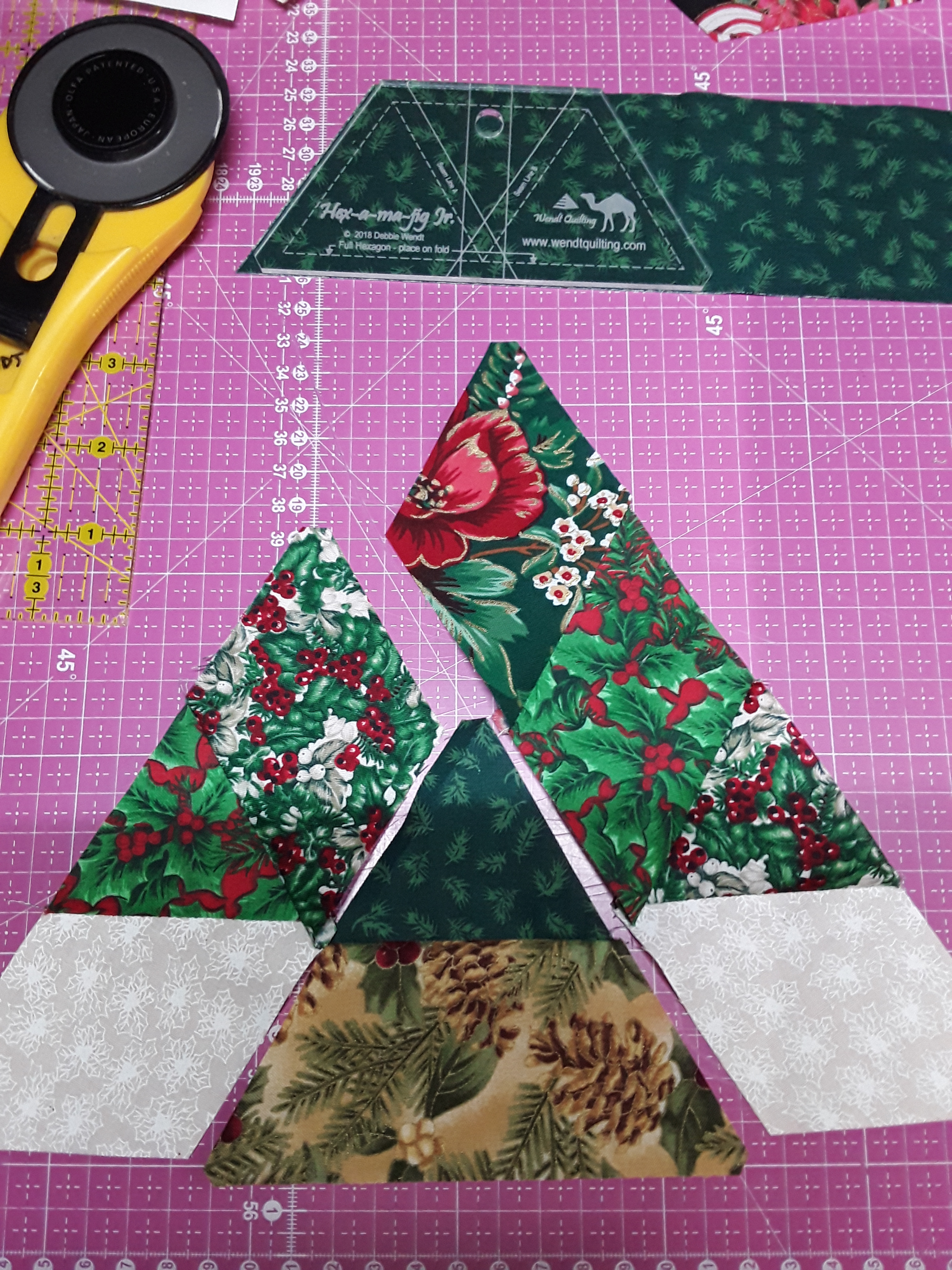 I love the Christmas in July sales and thought my project might be a push to get rid of…I mean… use up your “old” Christmas fabric so you can go buy more when those sales come around. I designed a tool that uses 2 1/2″ strips, Hex-a-ma-jig Jr. Whether you are using strips or scraps cut into 2 1/2″ wide pieces, Hex-a-ma-jig Jr. and my Winter Tree-Land pattern is perfect. The idea of Winter Tree-Land is to use 2 1/2″ strips x WOF, one light and one dark to make a variety of trees. Those two strips can make any one of the options below.