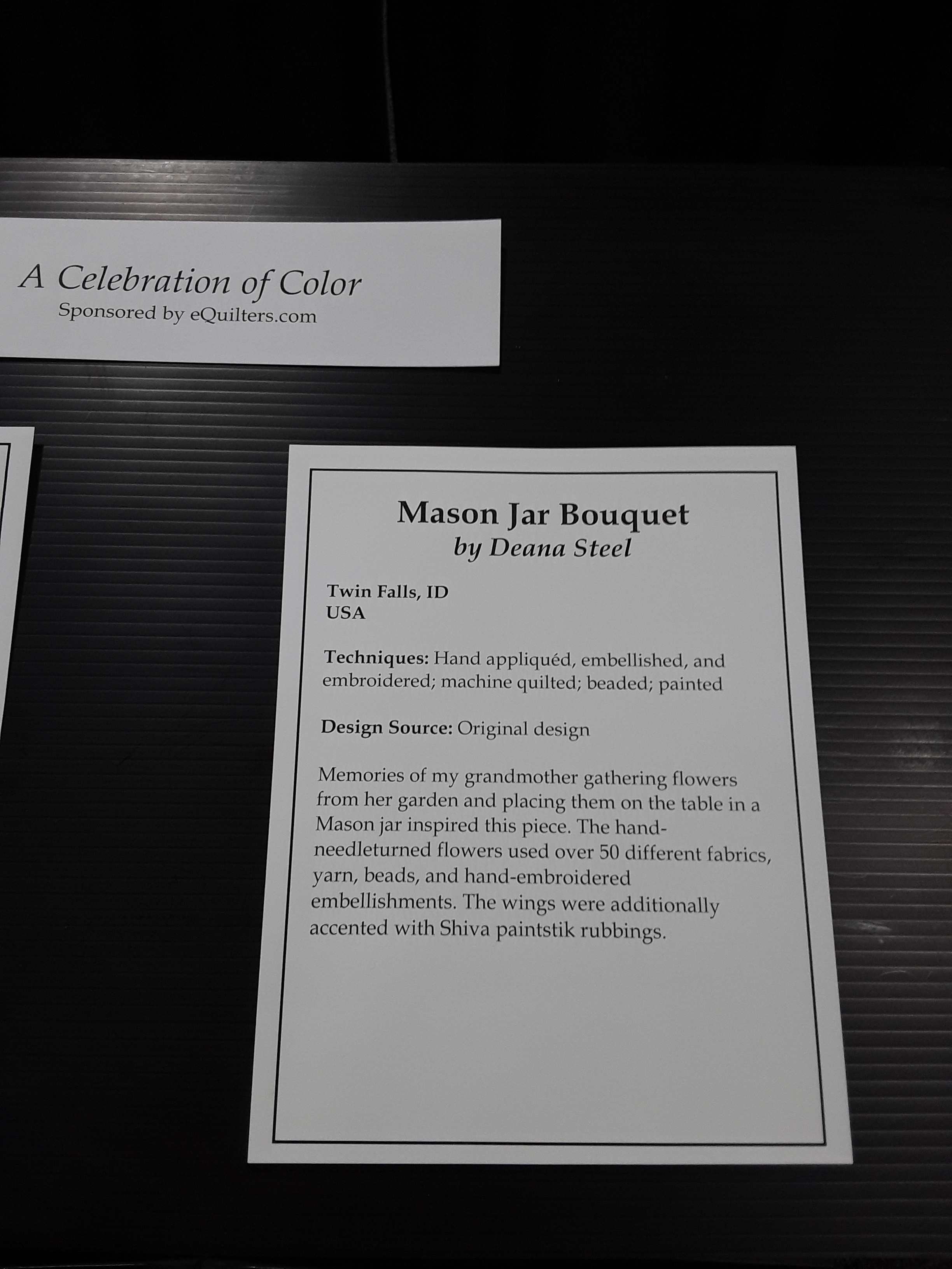 I was able to spend an entire day walking the show! Rarely do I get the chance to do this since I usually have a booth. My friend Deanna Steel’s Mason Jar Bouquet was in the Exhibit – A Celebration of Color. She does amazing applique and quilting. I missed seeing her at the show since I was teaching, but I was able to get a picture of her quilt! BEAUTIFUL work Deanna!!