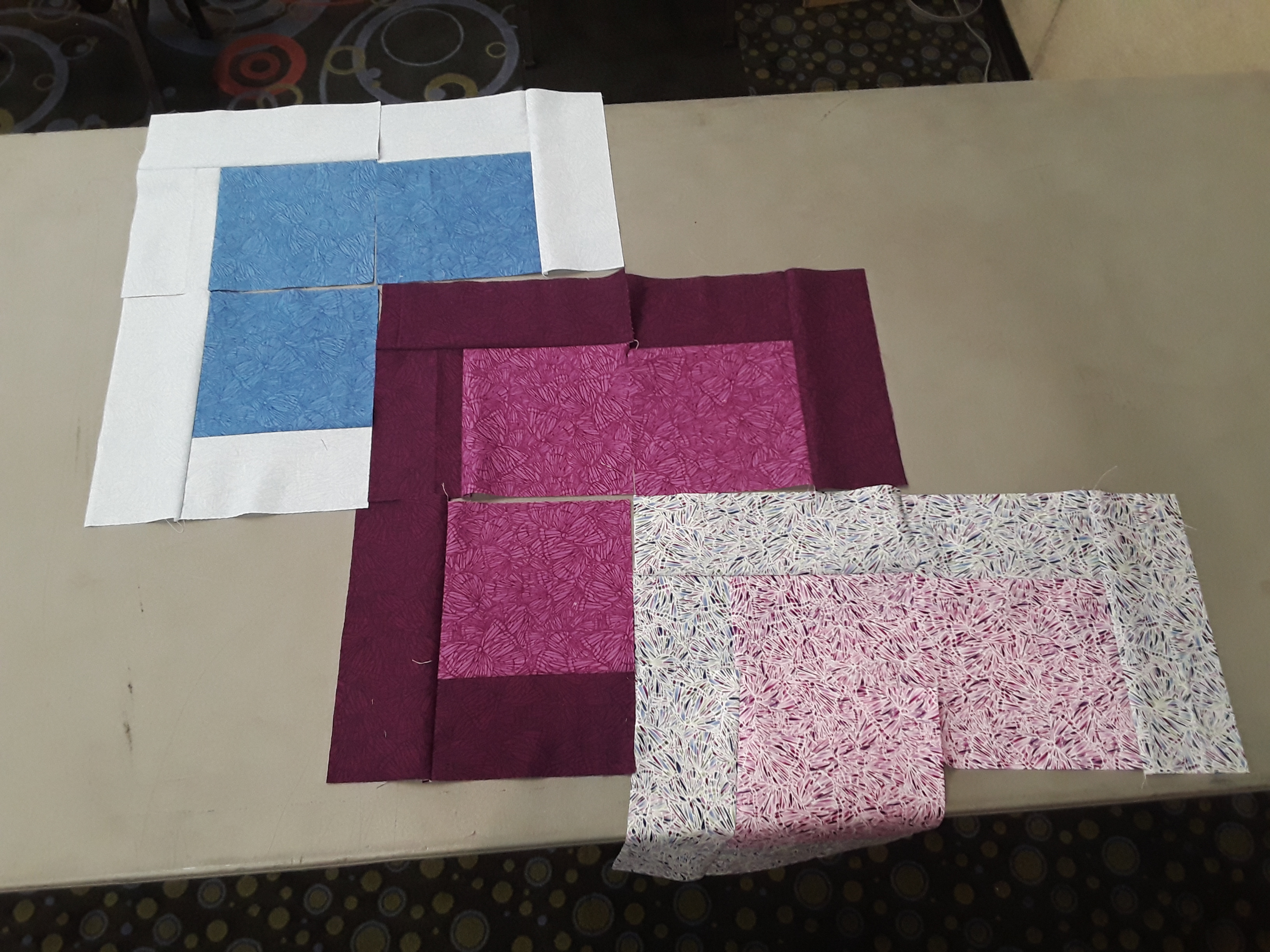 A great big thank you to those taking my classes in Salt Lake City! Great things happen in a classroom to learn trusted techniques, tools and new concepts. The trusted techniques included my “Done by Three” class with cutting fat quarters the same to make a quick quilt. More trusted techniques (sewing on bindings) and a tool (Brilliant Bindings) and new concepts (binding curved edges) in “Become a Brilliant Binder” and last but not least “Piecing is the Cornerstone” for trusted techniques of simple units that make up most quilt designs! I only took a few photos during class, so below is the start of Lynn’s and Bonnie’s Done by Three blocks. They both did a great job! Plus a huge well done to all my students. We had some laughs and great progress in bindings and blocks!