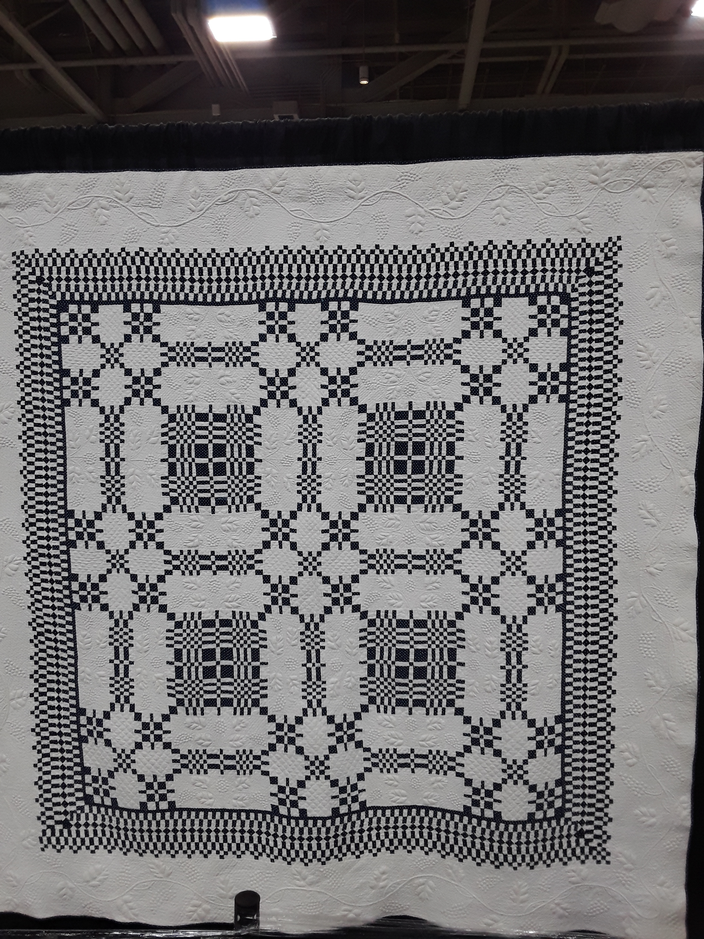 Plus here are two from the Blue and White collection. All of these quilts are antiques and the maker is unknown, so unfortunately we only see credit of the design and possible dates. They are from the IQF Corporate Collection. The quilt on the left is Fleur-de-Lis with beautiful feathers and on the right is Early Indigo Trapunto….and take a look at the amazing trapunto work!