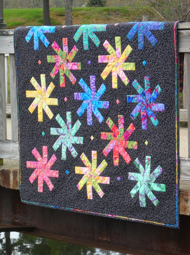 Last month for the Thimble Pleasures quilt guild the yearly challenge was due. The theme was Black and White with one color. I had a project I’ve had hanging around for MANY years. I decided it needed to be done and it fit the theme perfectly! I started this in a class I took in NH. Those of you in New England know this show has not happened for MANY years! Here is my little piece. It measures 19″ x 21 1/2″