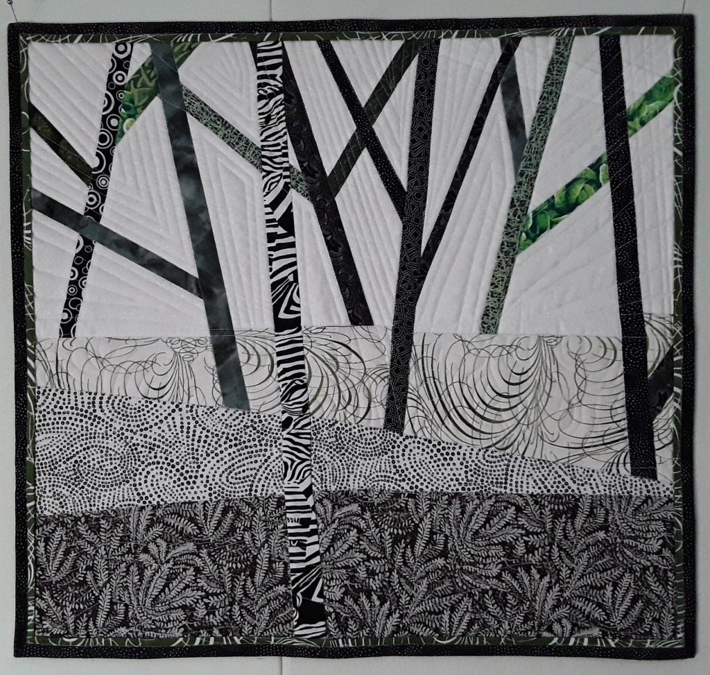 As I got further into finishing this, the lines from “The Night Before Christmas” kept being repeated in my head. “The moon on the breast of the new-fallen snow, gave luster of midday to objects below.” I love snow and the beauty of the moon on a snowy night! I’m calling my piece “Winter Trees on a Moonlit Night”. A bit about one of the fun fabrics that I used….can you see the Zebra’s eyes?