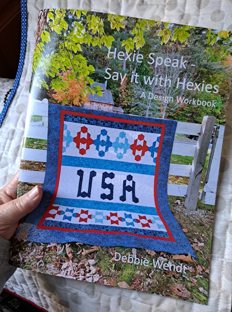 It has two complete upper case alphabets, one lower case, numbers, punctuation, 18 horizontal borders and 15 vertical borders. The cover is below The book includes different version of putting your letters and borders together into a quilt, wall hanging, pillow or table runner. A great way to “say it” with fabric using half hexies! My Hex-a-Mini is the ideal size to use! The book will be on my website for purchase by next week.