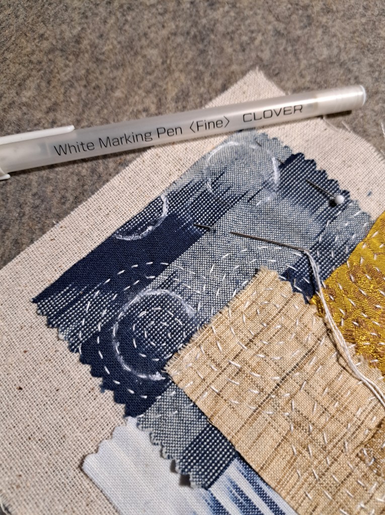 I have been working on more samples of Sashiko stitching in the Boro style, adding fabrics to a background. I will be giving a lecture on this and other “one stitch” techniques at the Original Quilting and Sewing Expo in Lakeland, FL in March. JUST ONE STITCH