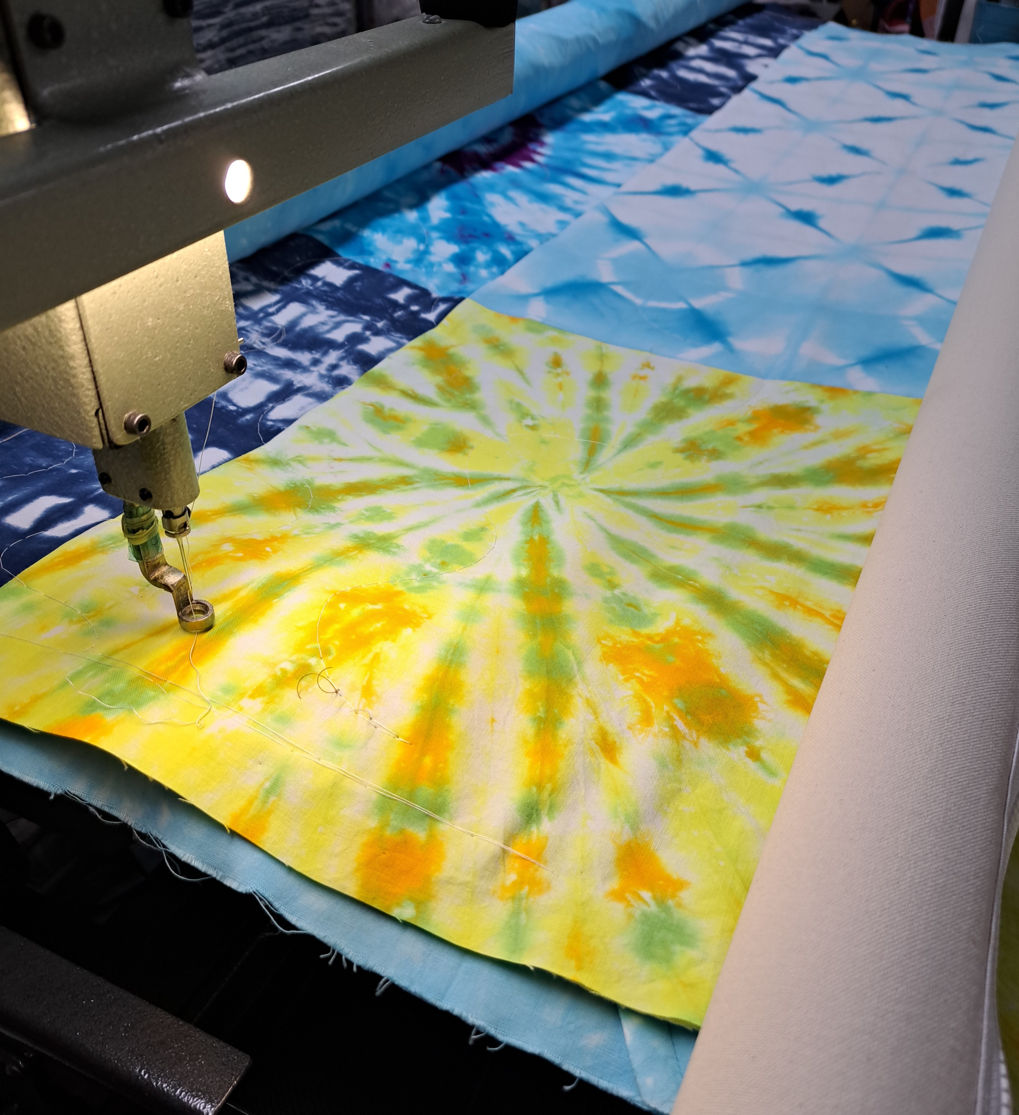 The quilt back I showed you last week is layered with the top and in the final stages of quilting. To keep all my layers together I basted it on my longarm! A giant, long stitch meander works well. I loaded the quilt onto the frame as I would any other quilt. But instead of quilting it, I basted. I am using a 12 wt. thread and quilting it on my domestic machine. The photos below is the quilt on the longarm and then the long basting that I did.