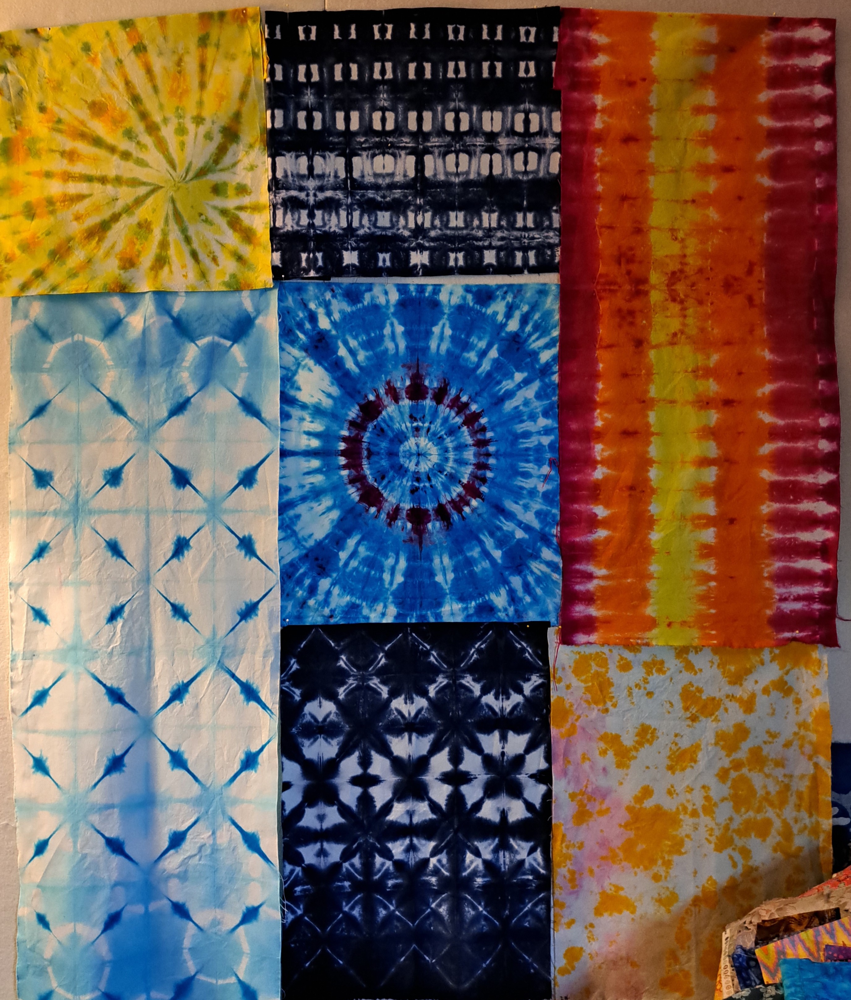 The challenge reveal at Thimble Pleasures was fun! And who didn’t take photos…oops! So, I’ll put the before sewn photo of my challenge piece below. The center FQ was the challenge piece. One of our members, Mary Thurlow, did a lecture/trunk showing some of her pieces she has dyed. As a hands on, we each got a FQ and got to spin, fold, scrunch the FQ as we liked. In the tie dye class she taught, we chose the colors to use and her sister, Betsy did the coloring. I LOVE how mine turned out. Instead of adding a bunch of “other” fabrics, I use some I dyed in the class. I tried a bunch of different folding techniques, similar to Shibori and other ideas of clamping. I’m really happy with how my “quilt” came out. I made the quilt in the style of Kantha, a technique used in India of layering old saris into a quilt. My “in the style of Kantha” is three layers of cotton fabric. Much heavier than saris. Instead of hand sewing with a cotton thread, I use 12 wt cotton in a variety of colors. I showed some of the stitching lines last week. I’m thrilled I got third place in the challenge.