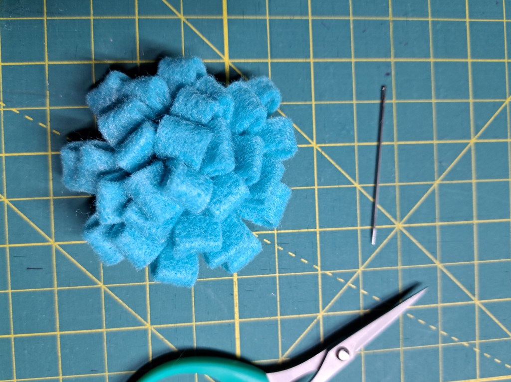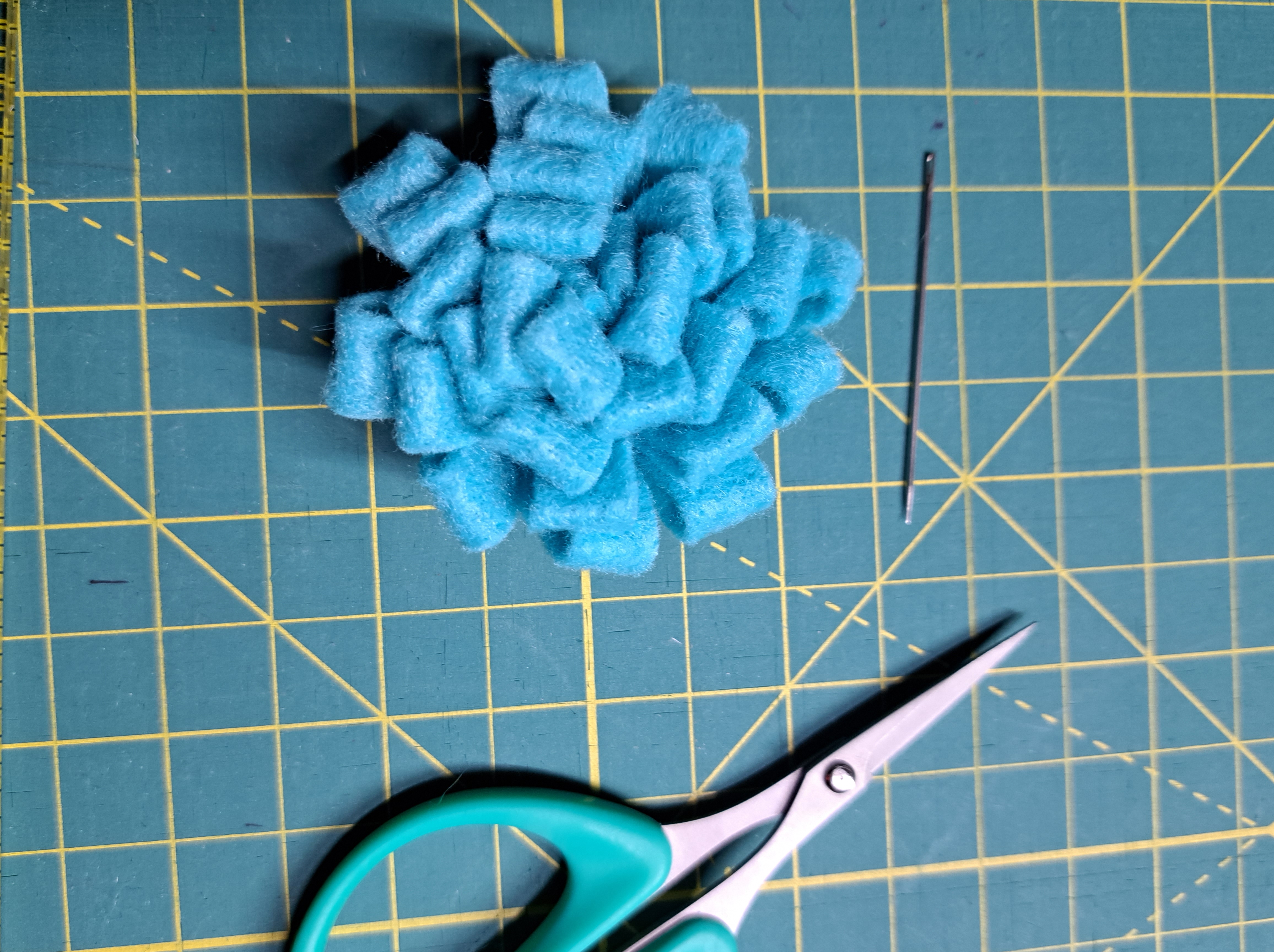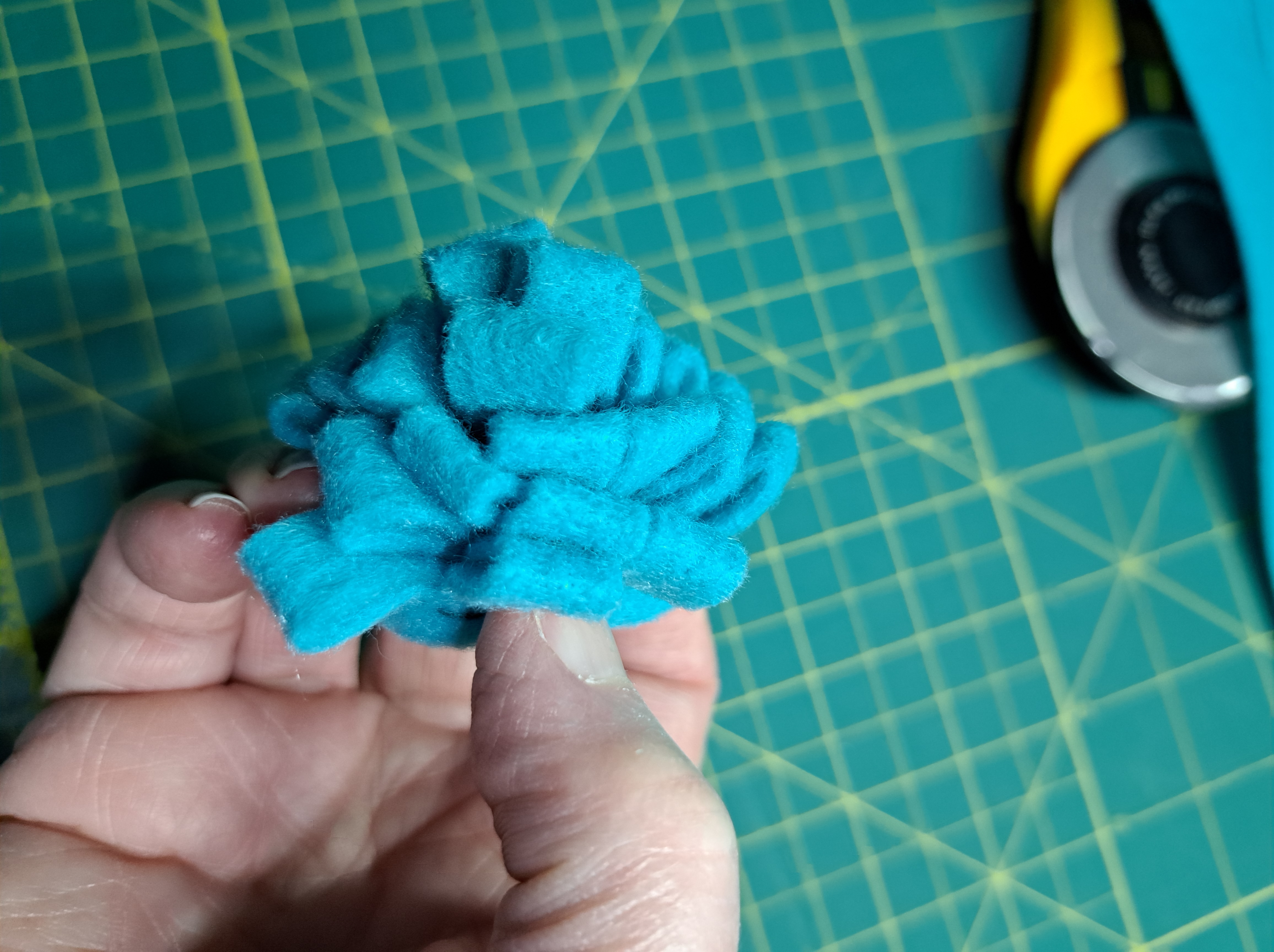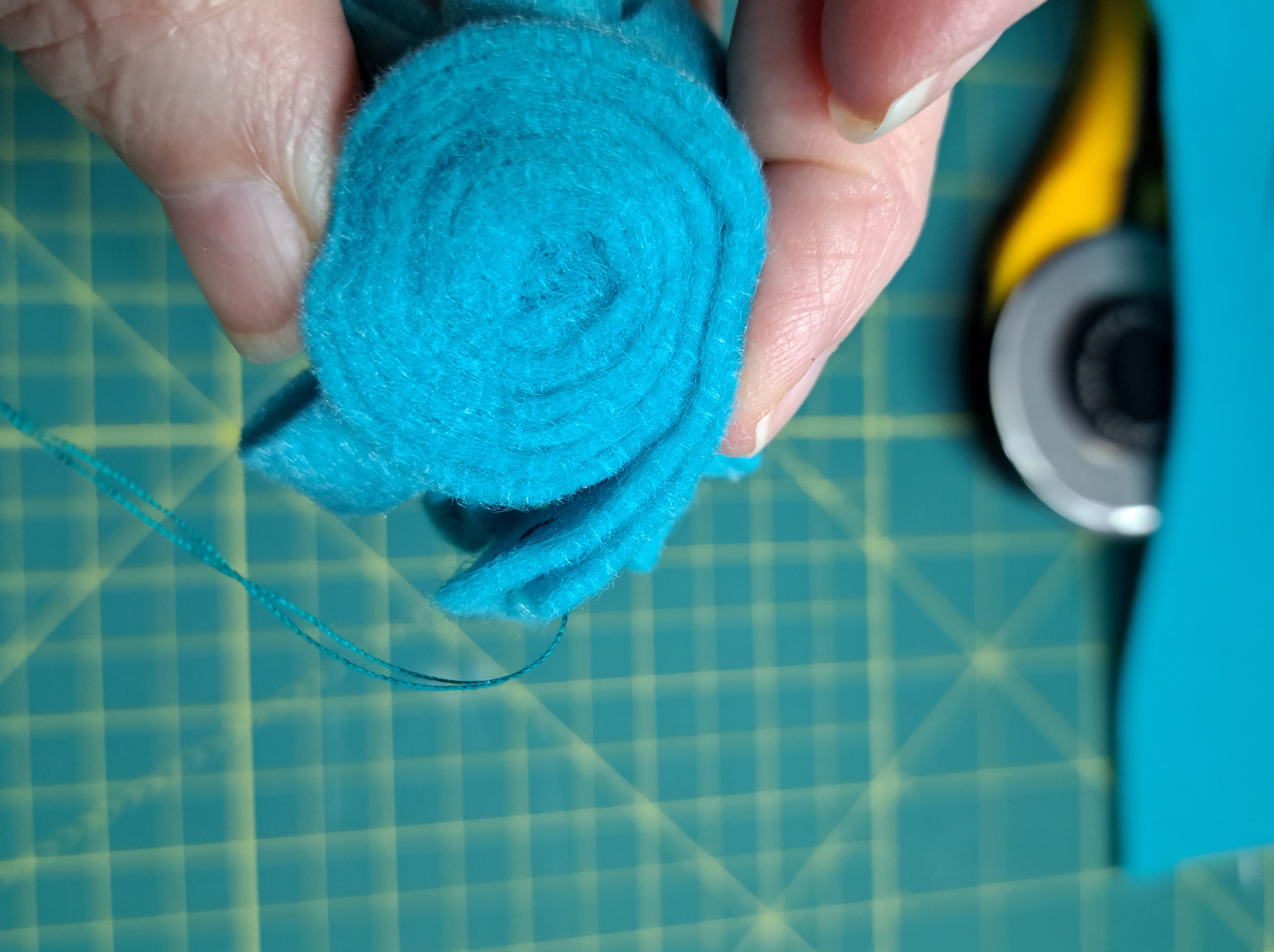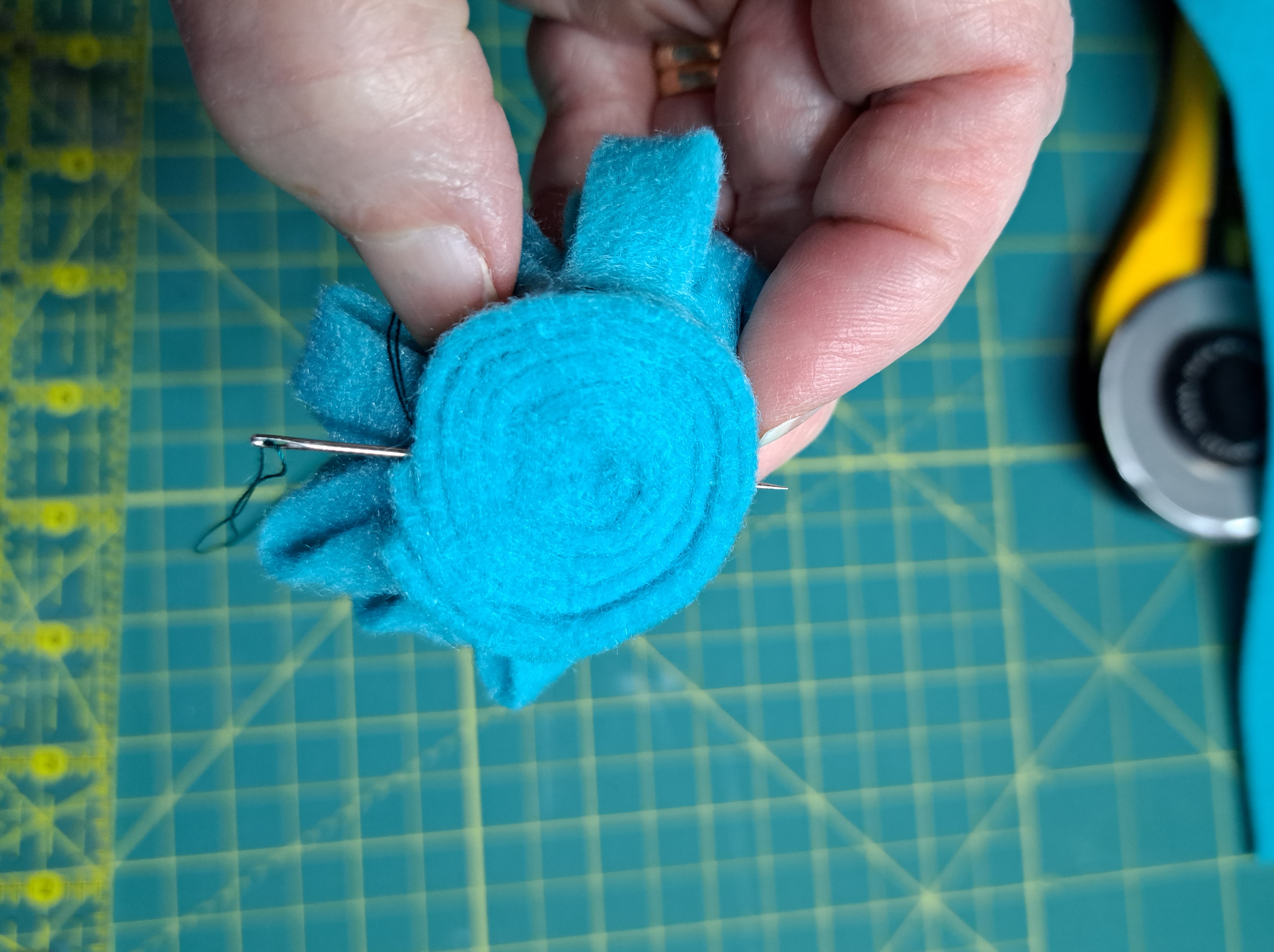 Run the needle and thread through the bottom edge of the swirl, back and forth to hold the swirl together. Finish with a stitch and knot.