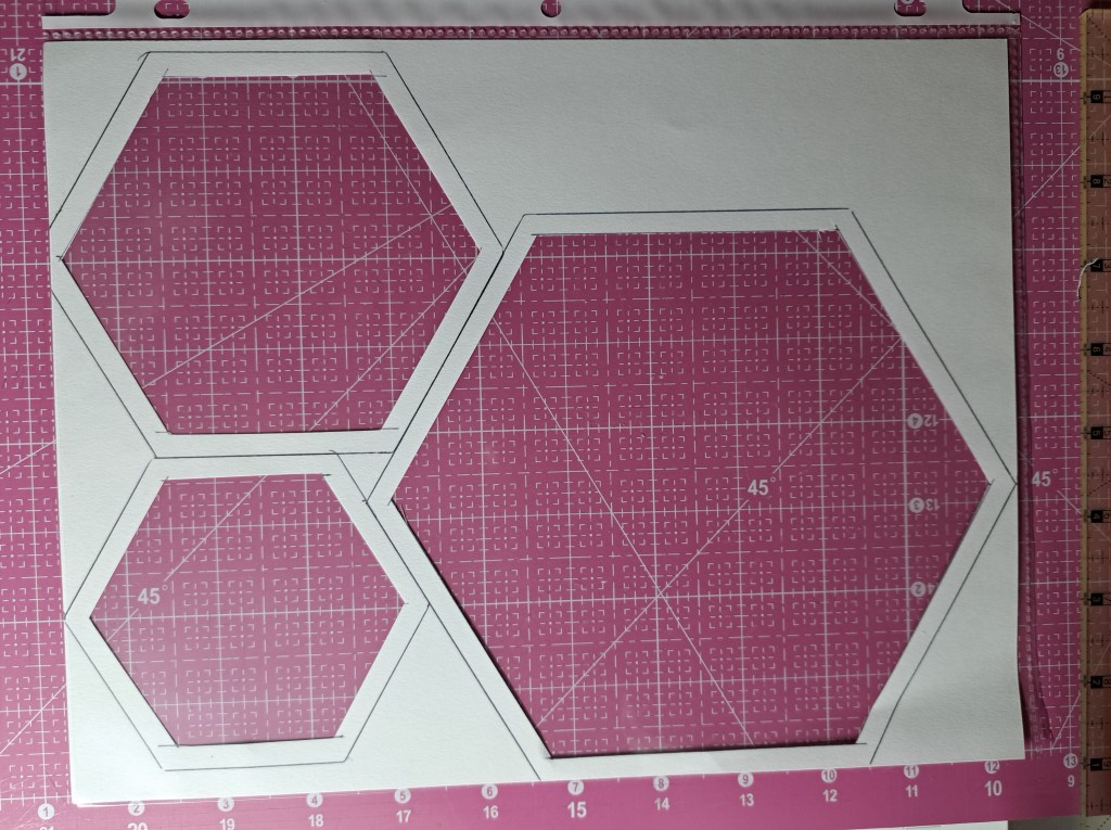 She had same samples of how the blocks go together using some fabric with Marvel characters. FUN! So off to a store that I knew carried similar fabric. Many of the license fabrics can be found at box stores. I wanted to be sure the characters would fit inside my Hexie shapes. So, I made a template of all three sizes of my Hex tools. Now I can see what size would work best! The template is below. I used card stock and carried it with me to the store in a plastic sleeve.