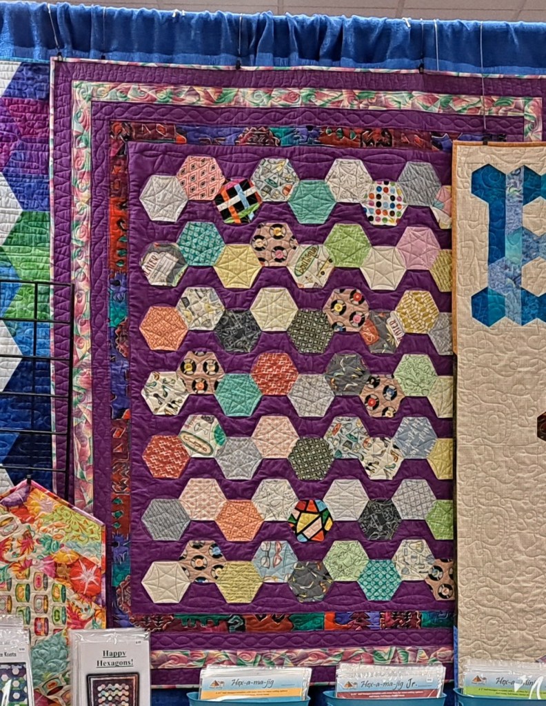 Last week I introduced you to a pattern by my friend Nancy Hinds called “Happy Hexagons!”. If you look closely at the hexagons she put in the quilt some could be fussy cut. What is fussy cut? When you feature an item, character, flower, word, etc. in a shape. Nancy used Hex-a-ma-jig Jr. for her quilt that was hanging in my booth in Paducah.