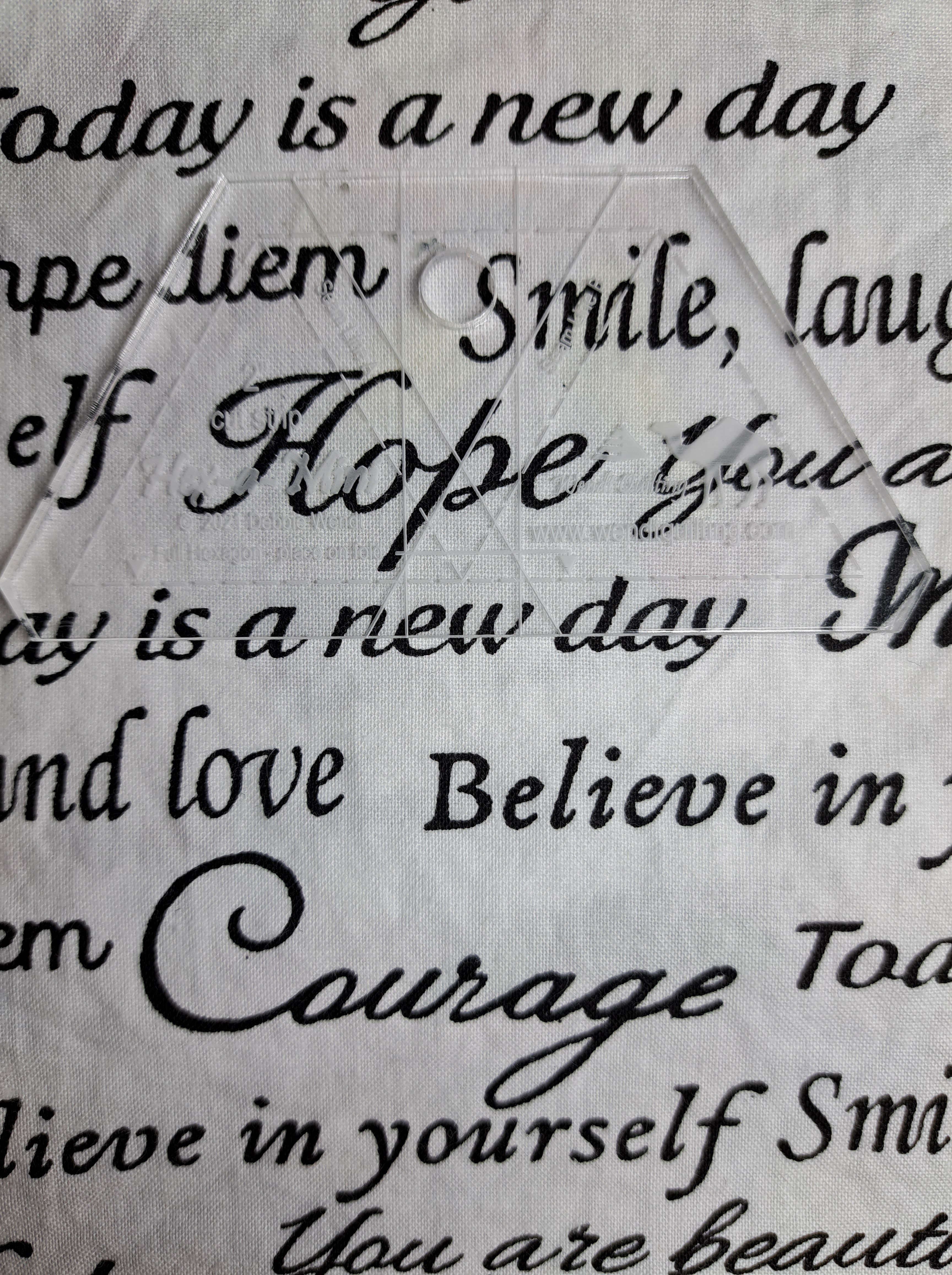 I had words on fabric leftover from a guild challenge last year. I used Hex-a-Mini to focus on just a word or two at a time. As you can see, Hope was several time across the fabric. I like it with laugh underneath it better than what is shown in the template. Fussy cutting the words was fun.