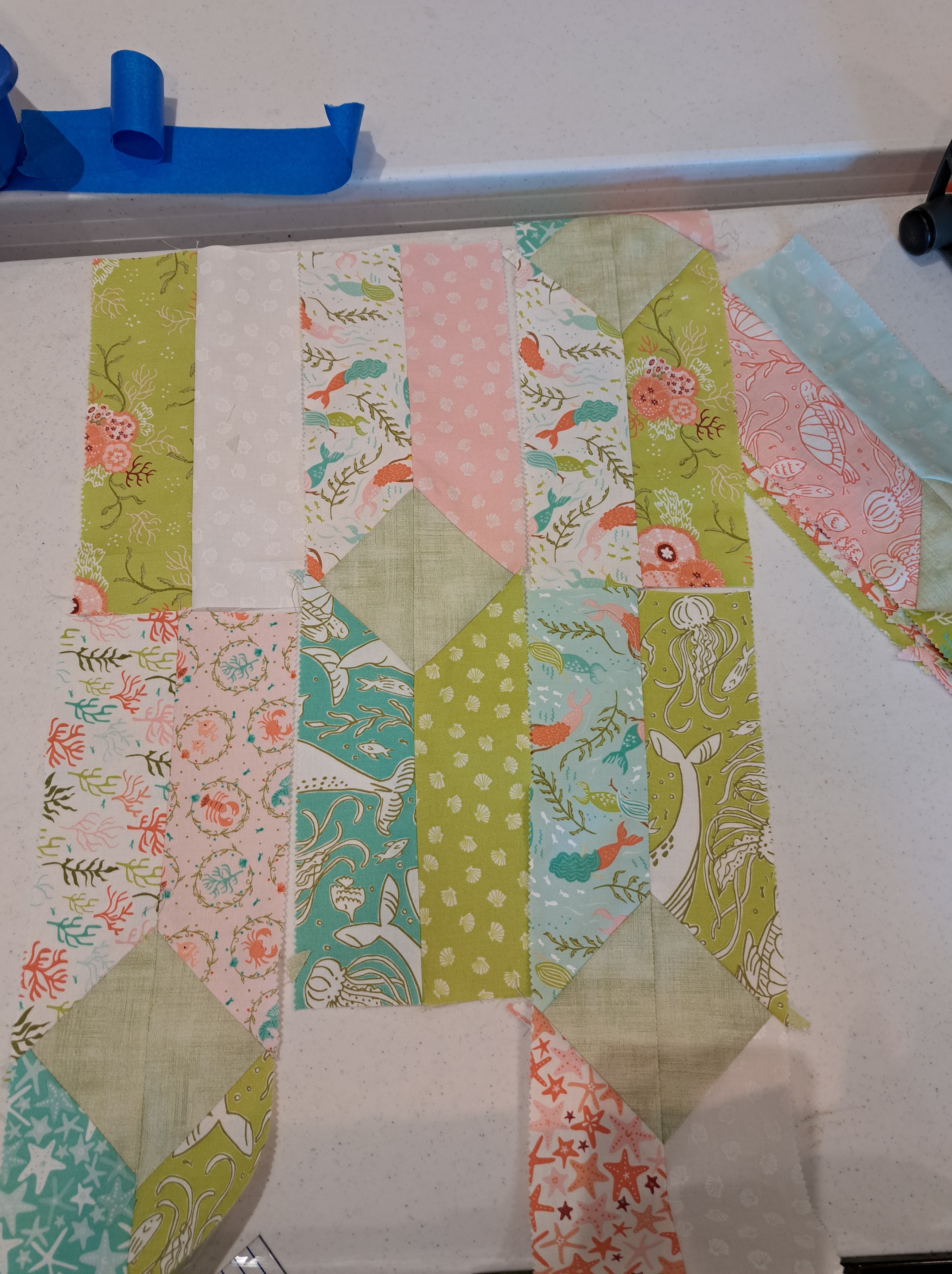 Helen had these adorable sweet prints. However, the strips had directional printed motifs. She will put it together across the quilt instead of vertically to show off those wonderful fabrics.