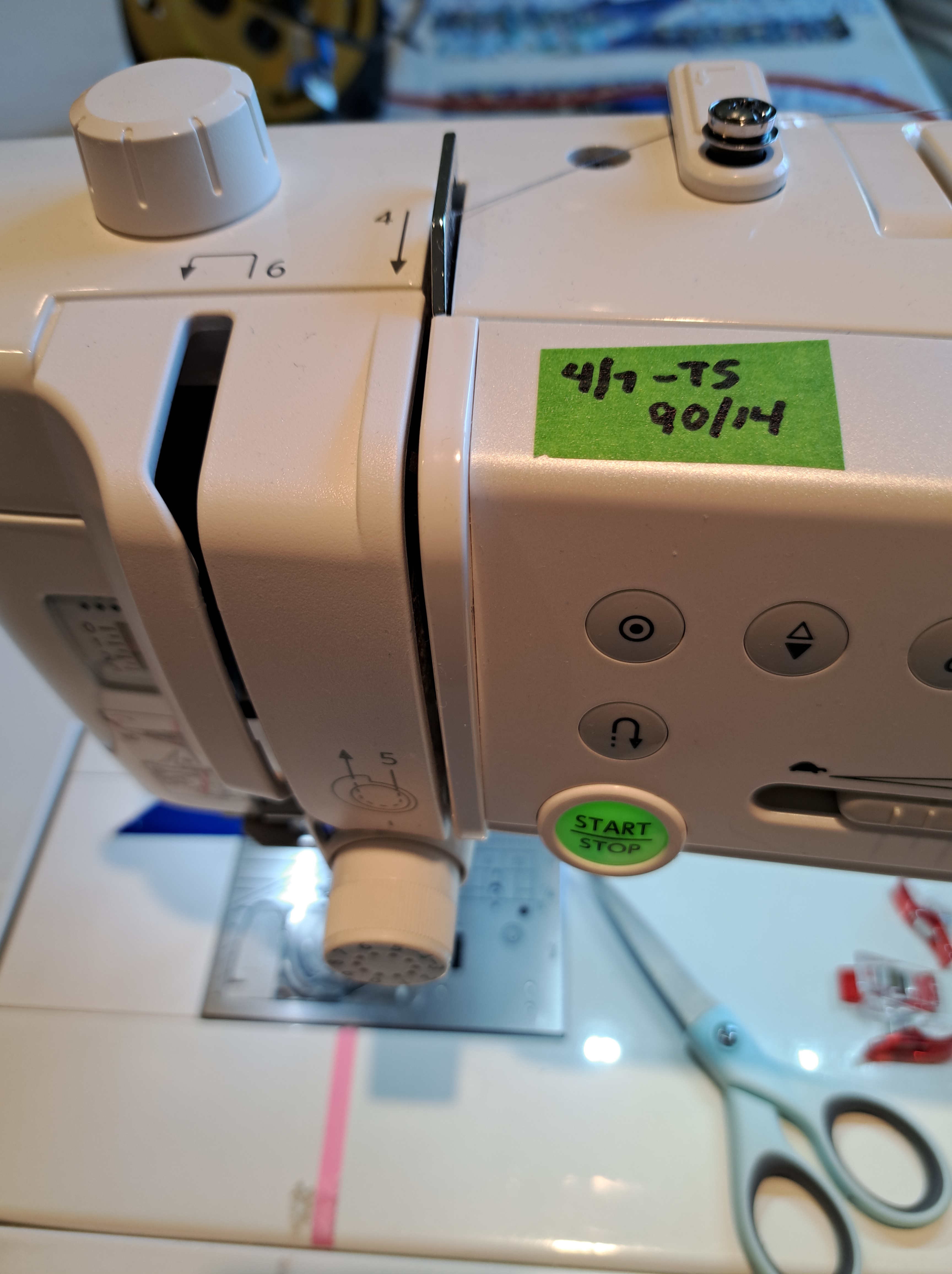 AND she has our two tips for today. During class, I always walk around to look at what everyone is doing, answer questions and discuss “things”. Michelle had two pieces of “green tape” like blue painter’s tape on her machine. #1 – When her machine was last serviced! and #2 – which needle she had in the machine and date she put it in. Brilliant! Thank you Michelle for such great tips in keeping track of important sewing machine information!