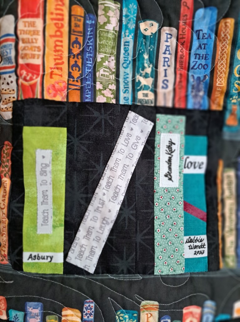Now for the label….just do it! I feel it is important for you to “sign your work. Artists do!!! and so should you. My sister loves books so I found a great book shelf fabric and used books to represent her 38 years in education on her label. She started in vocal music and then moved to be a school counselor. She is going to have fun with her grandma duties next year!!