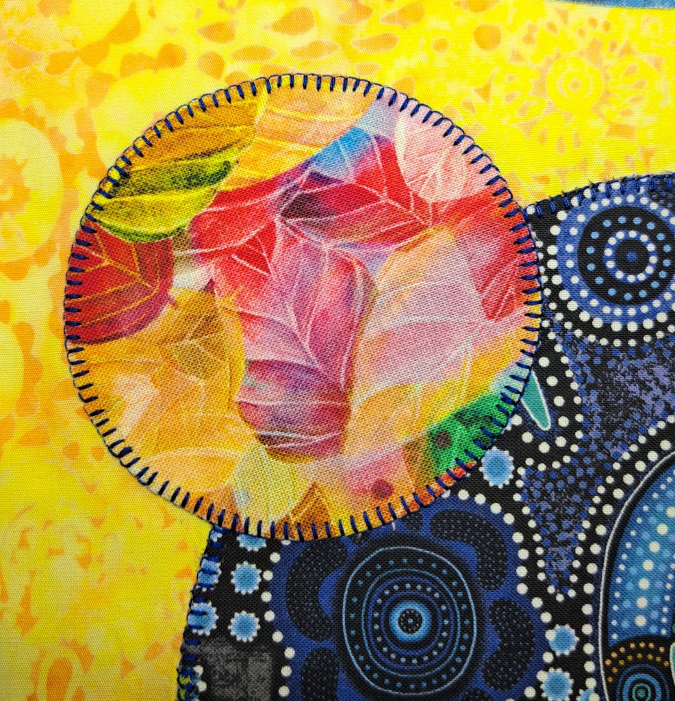 First determine where the top applique piece will cover the bottom applique. Stitch the bottom layer of applique onto the background skipping the section where the top applique piece will be covering the bottom layer. Look closely, the buttonhole stitching on the blue is complete but not along the edge where to top applique piece is placed.