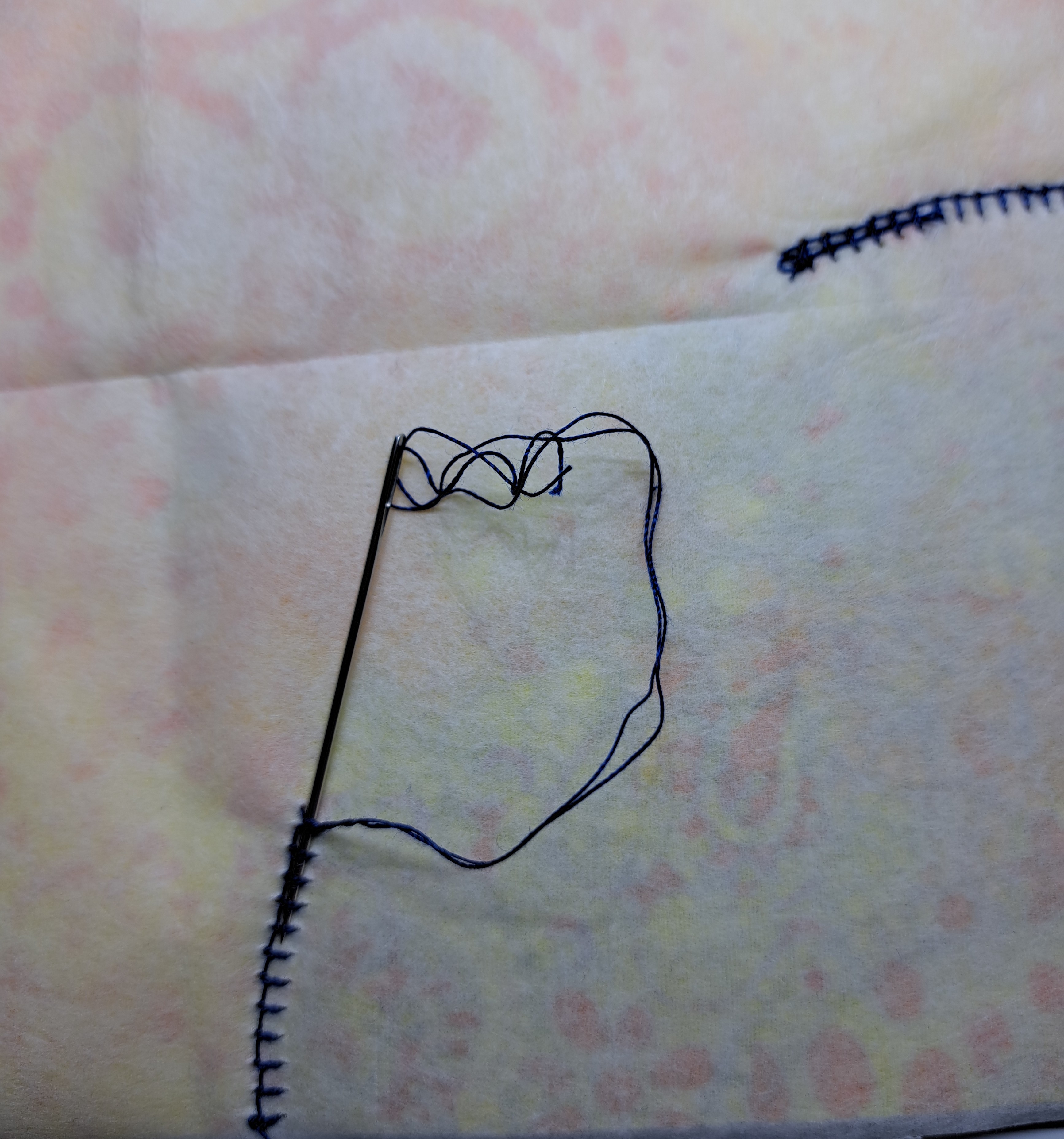 I am working on a project and machine applique is the focus today. A couple sections have one layer of applique on top of another piece. The bottom layer of stitching is showing through…….as the photo below. Not a good look, especially with the navy thread. This placement was an afterthought, so I had to place it over stitching I had already done. I want to share how to prevent the “show through”.