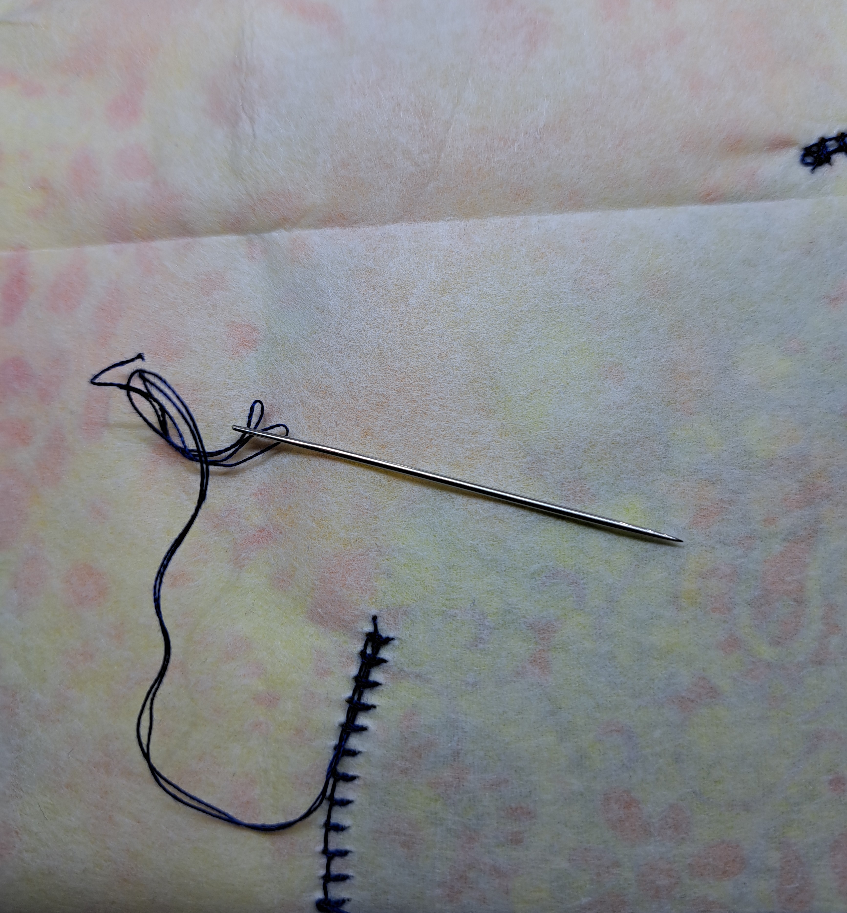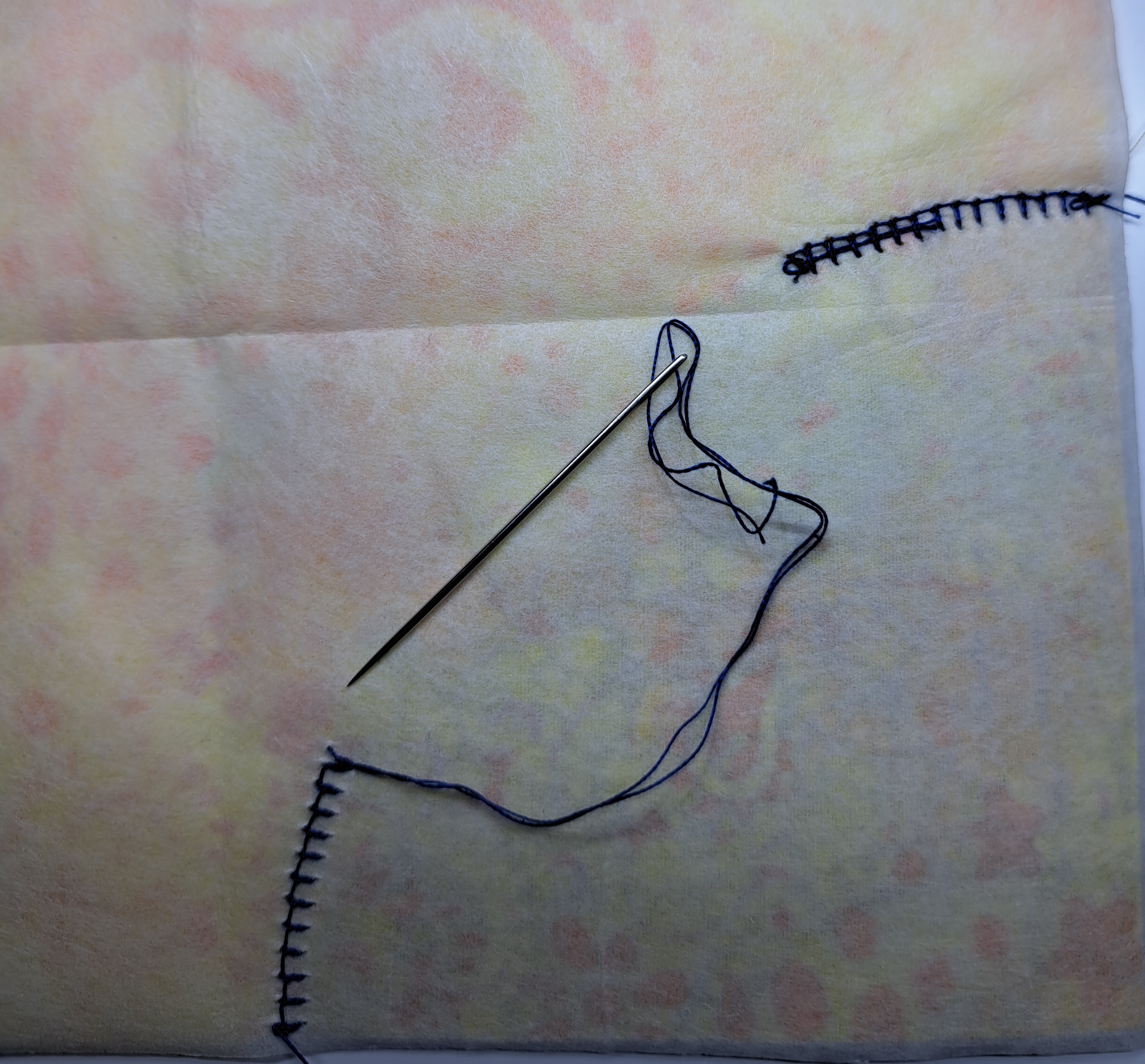A. Tie off your thread on the back, B. Run the threads under the line of buttonhole stitches. C. Trim threads for a neat and tidy back and to prevent the threads from showing through on the front.