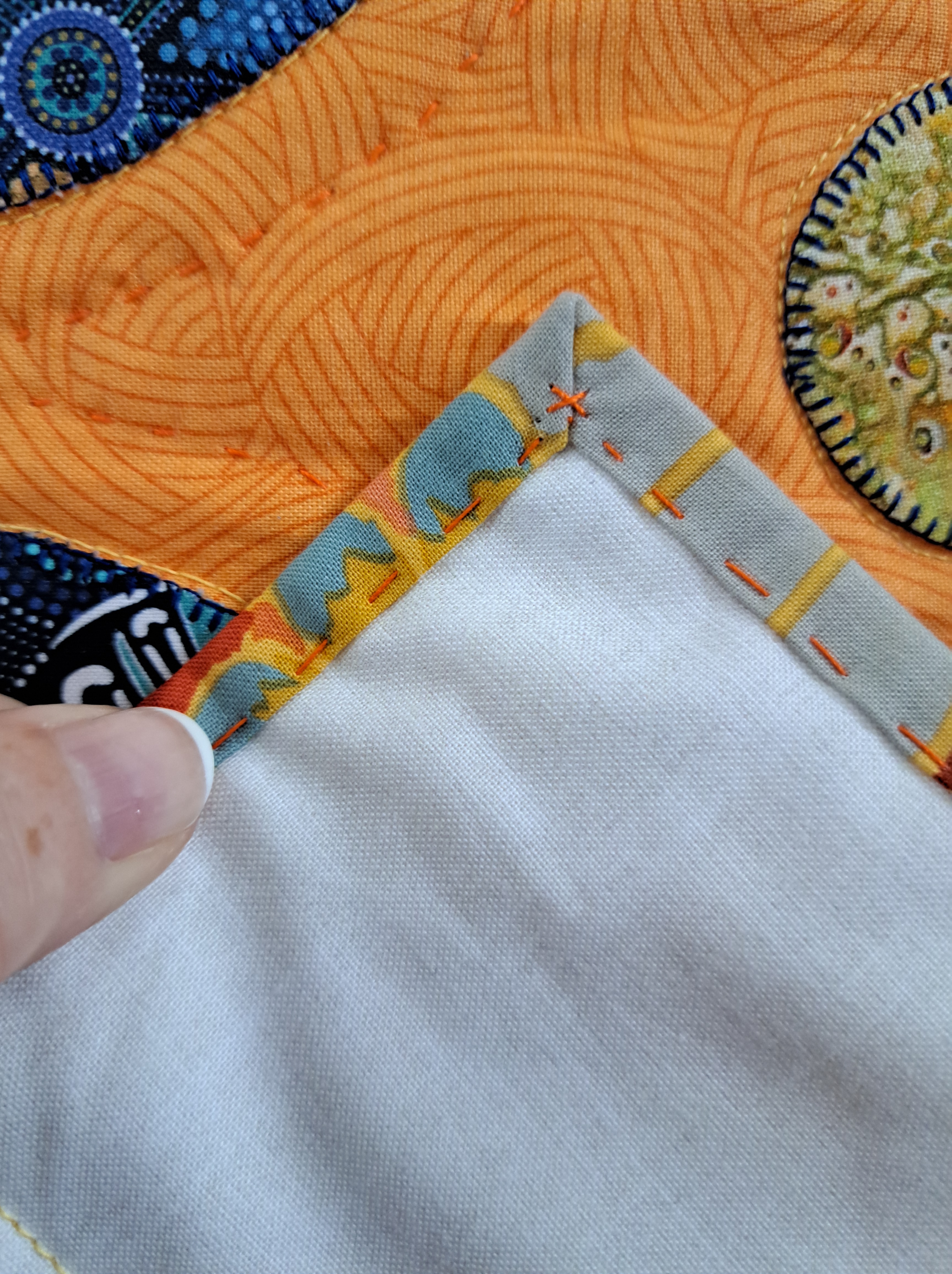 #1 – I used Elmer’s glue to hold the binding in place and ironed it dry. It helped my hand/wrist, since it is still tender from the sprain. Plus, no need for pins or clips! It allowed me to “fly” with the stitching. (You can see a glue spot in the top right side of the mitered corner fold in the next photo. The glue will easily wash out! It is made for kids and water soluble.)