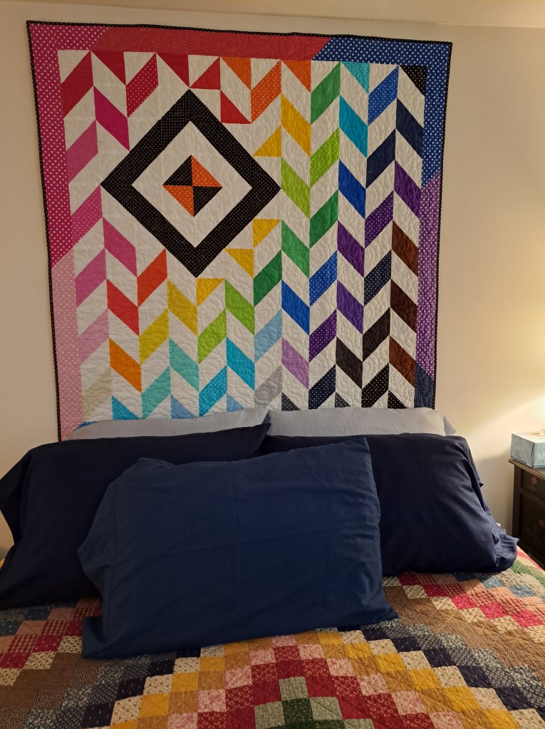 Soooo, what do you do after you accomplish a huge deadline??? Do you jump right back at it with a new project? Do you dig out an old project that needs finishing? Do you fall in a pile on your sofa? Hmmmm! I started to work on a new project, then I wanted to take time to work on two well overdue quilts, then I started trying to organize my sewing space, then I cleared out quilts from a guest bedroom, then, then, then! Yes, I jumped for one thing to another. I didn’t get far on much. I did get the guest bedroom ready for my parent’s visit. That was highest on the list! I’m sitting here writing tonight thinking about all the things I could have done, should have done and what won’t get done. That was a long way of saying I’m done in for this week. The only sewing I accomplished was to put a sleeve on a quilt so I could hang it in the guest bedroom. Check!