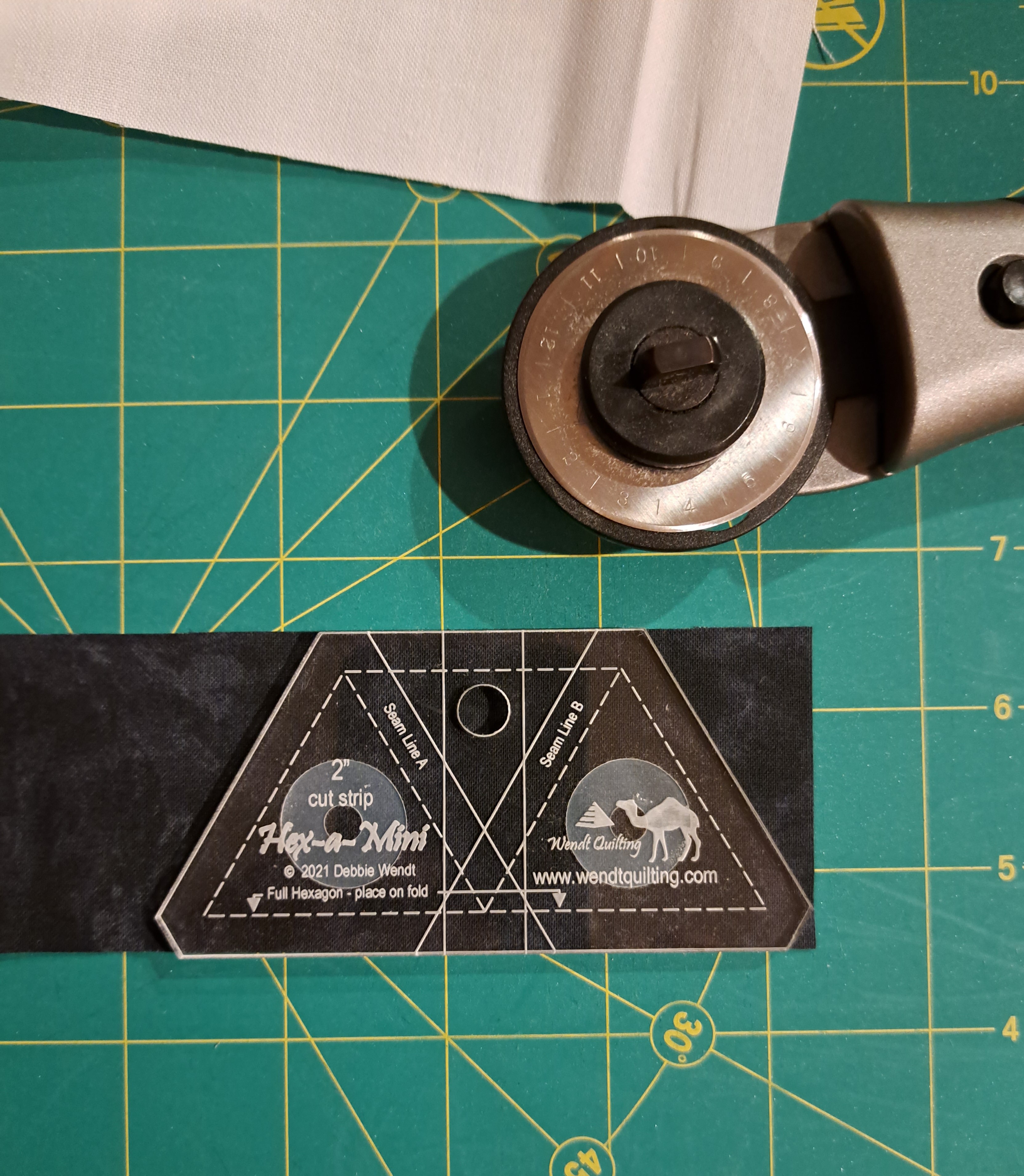 I pre-cut the strip width of the size template I am using. Hex-a-Mini is 2″ wide so that is how wide I cut my strips across the width of fabric when I have several to cut.