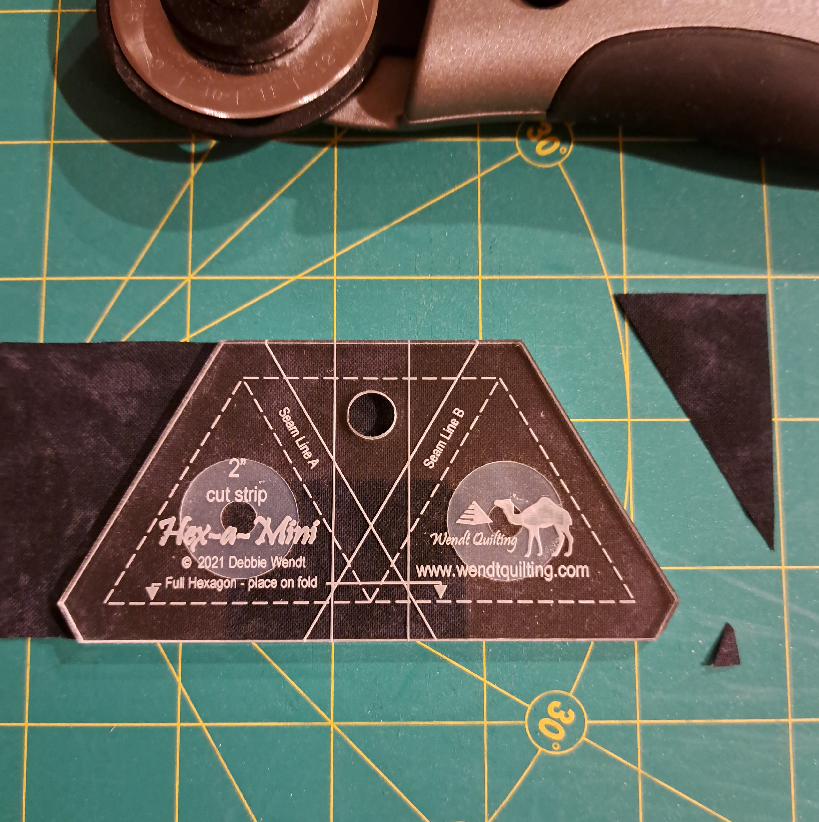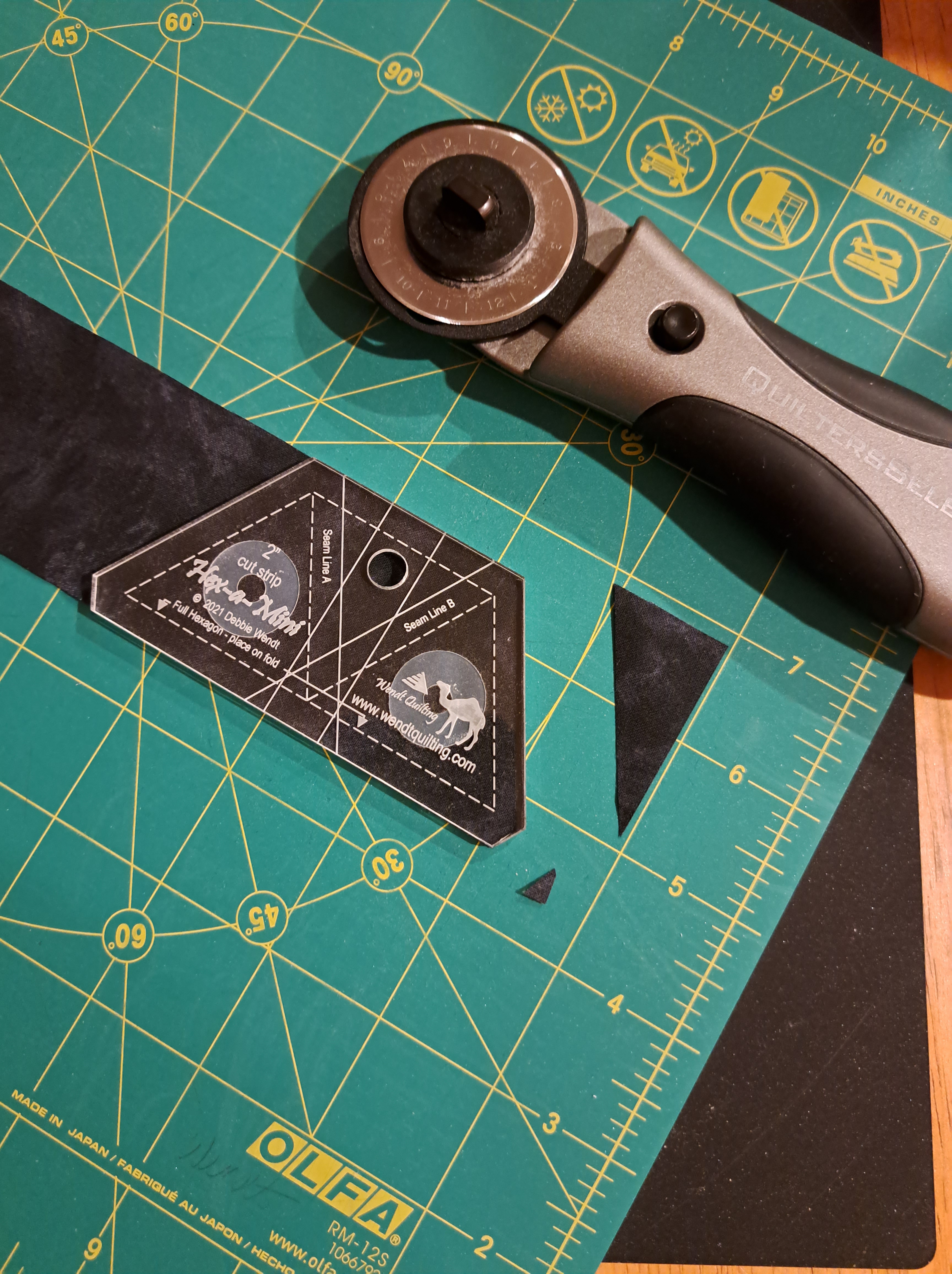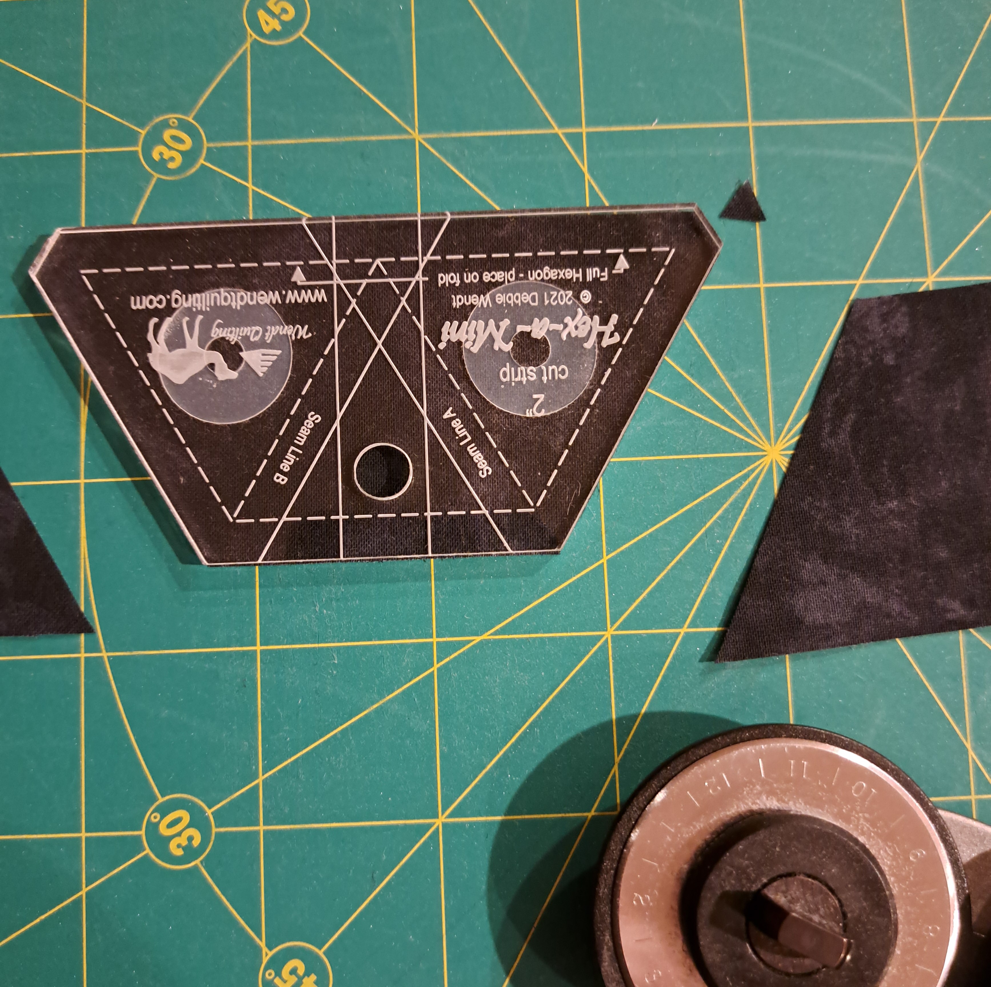 Once the rotating mat is turned, I cut the last side. TaDa! Another half hexie ready for my project.
