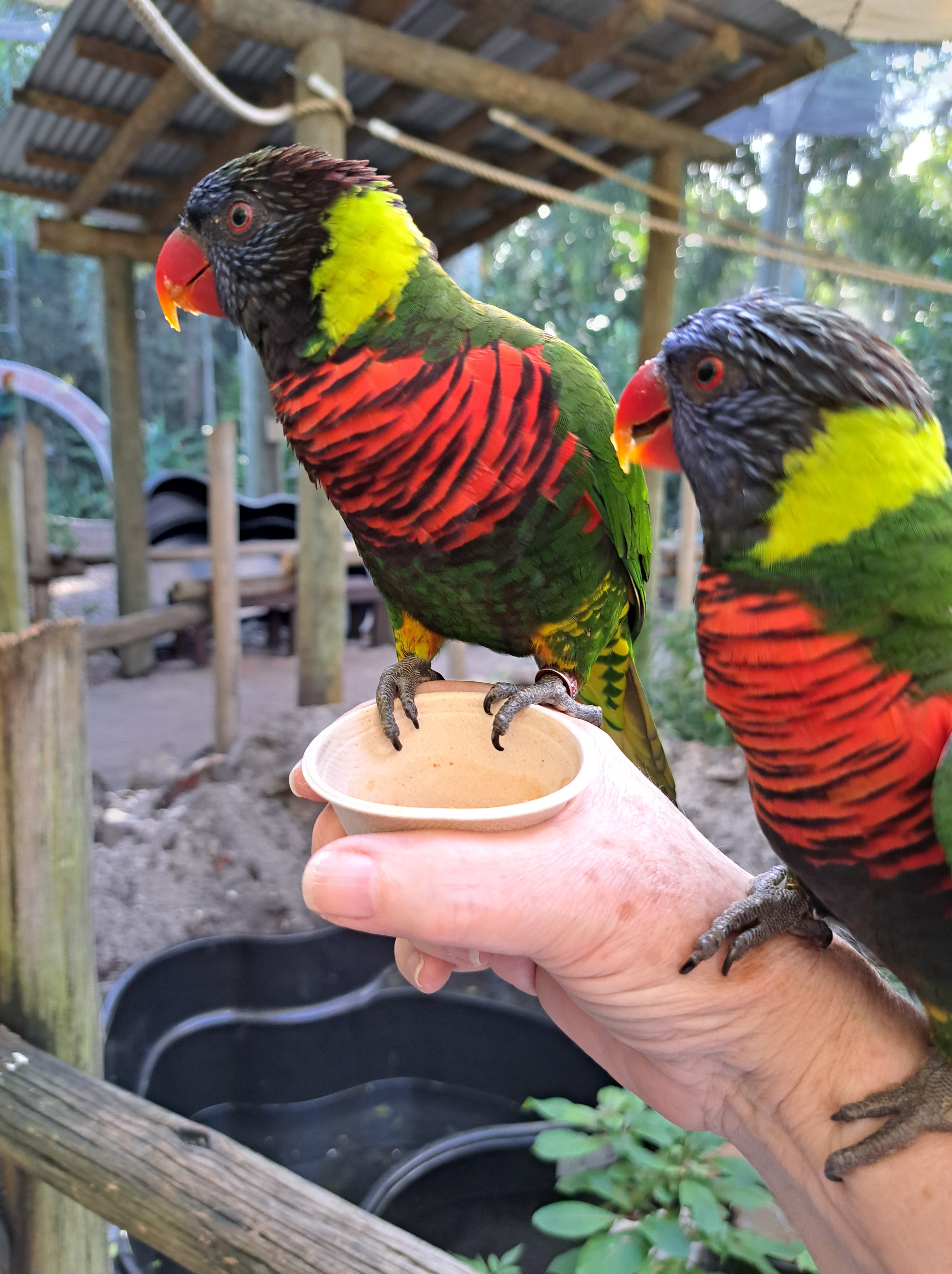 An even closer experience with feeding the Lorikeets! WOW! I had four on my hand/arm at one time. Noisy little birds! Look at their feathers. Great inspiration for choosing colors for a bright quilt!